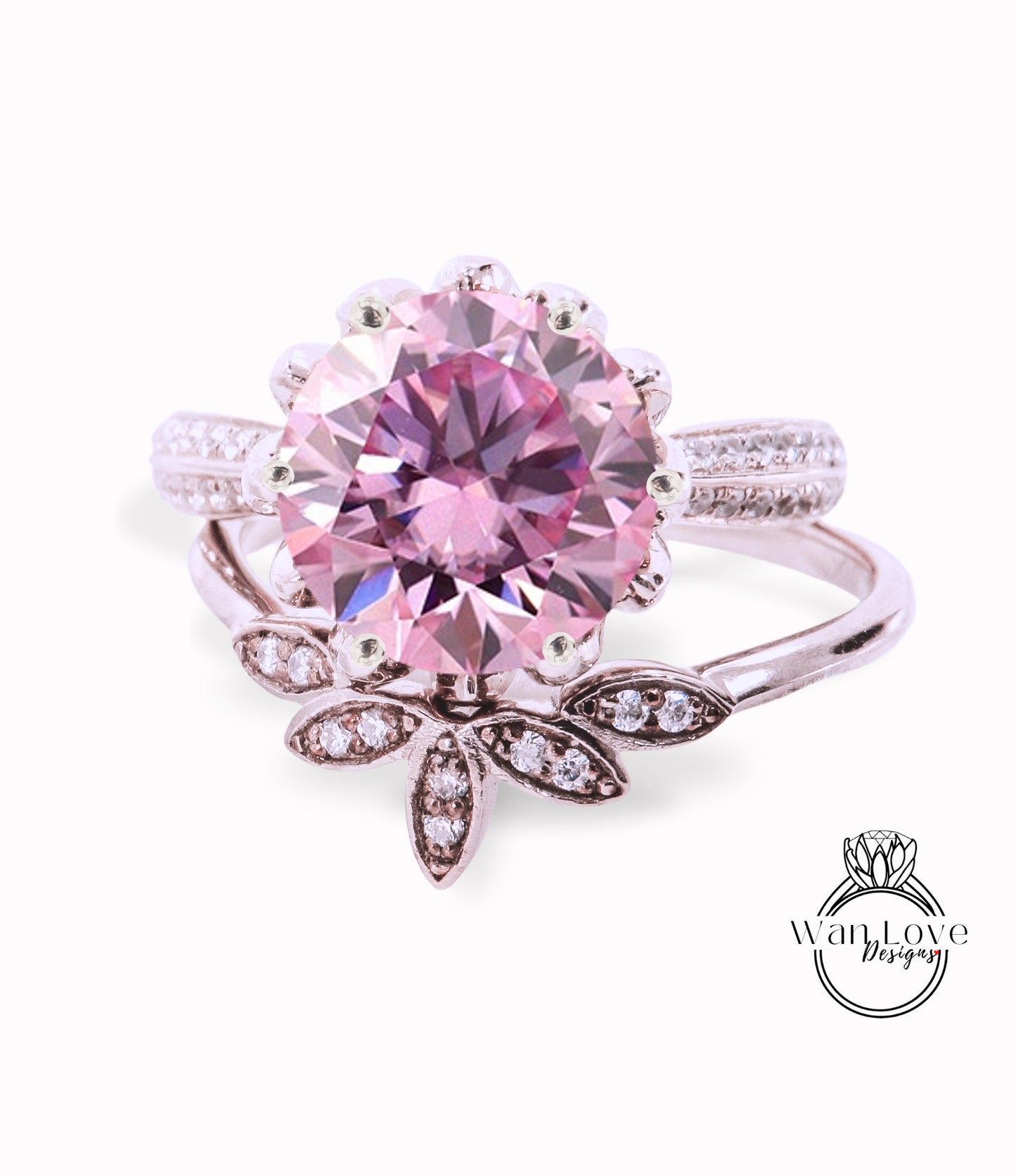 Round Pink Moissanite engagement set vintage Rose gold Lotus Flower engagement ring woman Diamond wedding set Unique Bridal Anniversary set