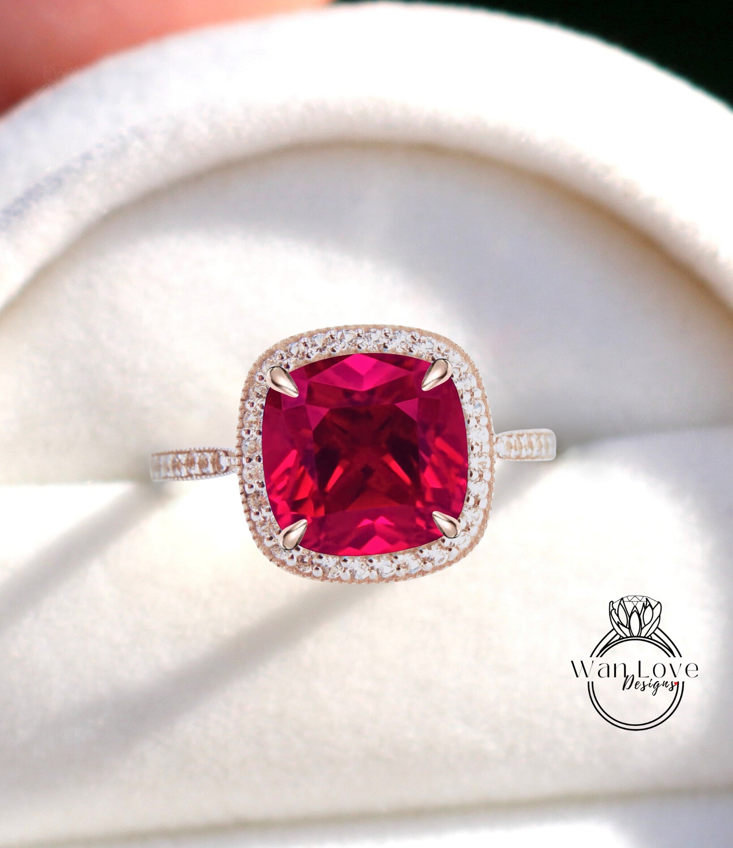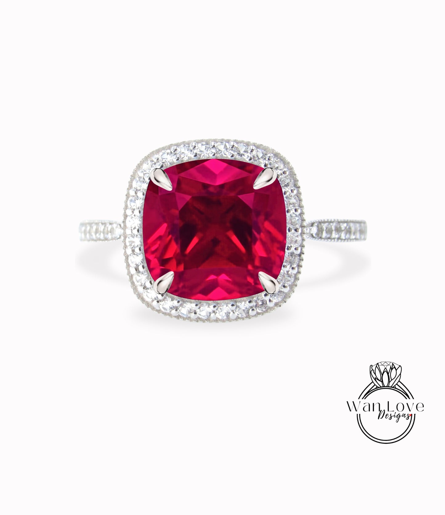 Ruby Diamond Antique Milgrain Cushion Halo Engagement Ring, Custom,Anniversary Gift,Wedding,14k 18k White Rose Yellow Gold, Anniversary Gift