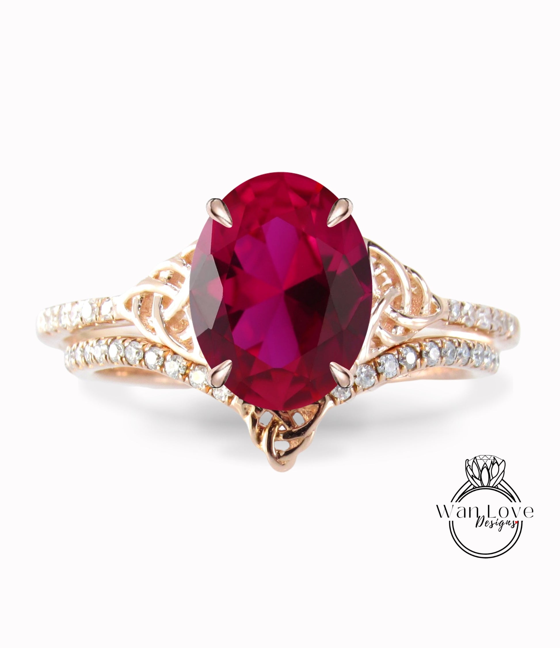 Ruby & Diamond Celtic Love Knot Oval cut Triquetra Engagement Ring Bridal Curved Nesting Wedding Band Set, Anniversary Gift