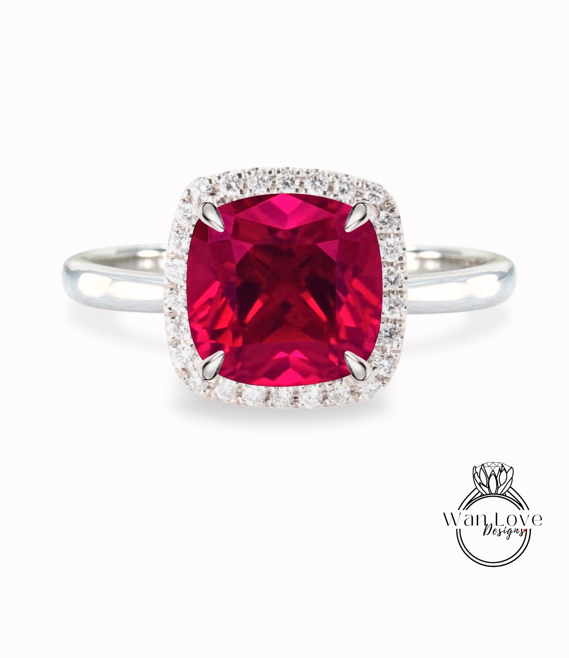 Ruby & Diamond Cushion Halo engagement ring rose gold tapered plain thin dainty band art deco anniversary gift