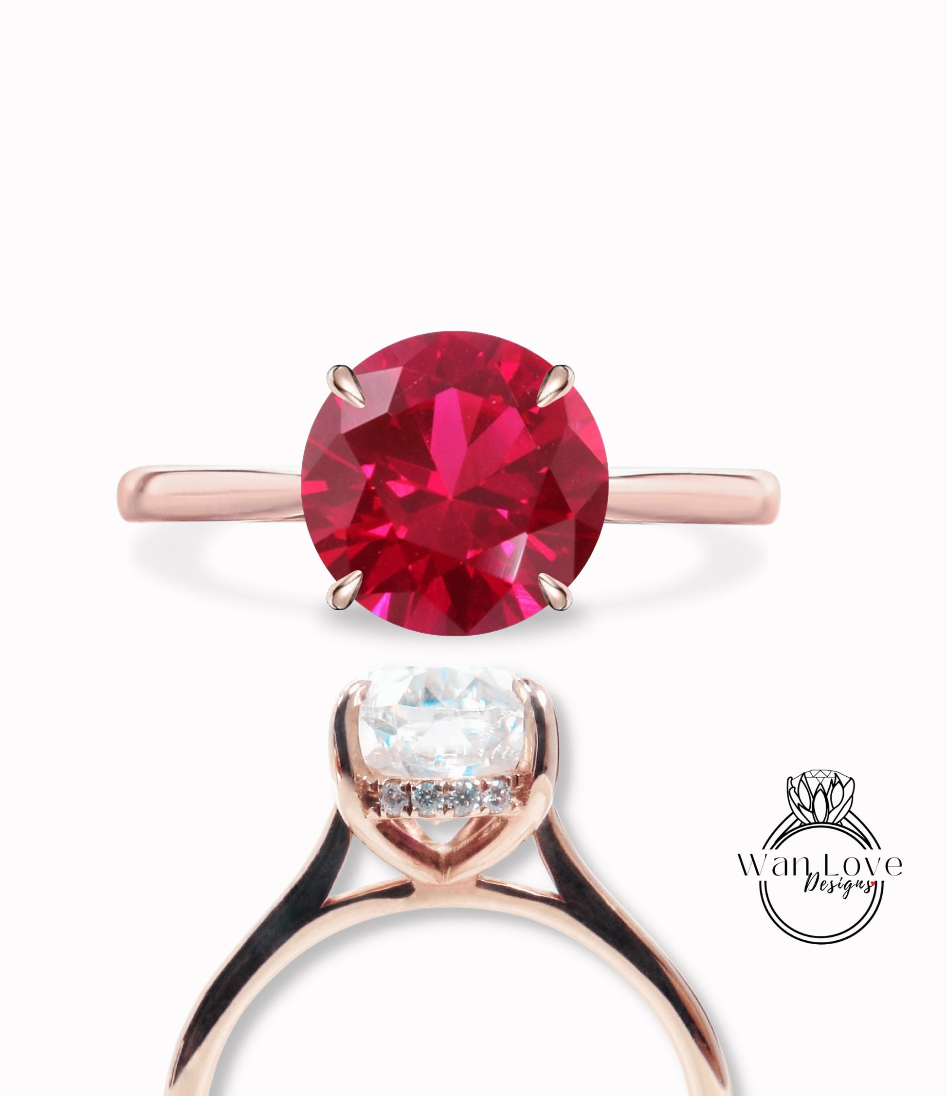 Ruby & Diamond Round side halo plain band Engagement Ring, Cathedral Basket 14kt 18kt Gold-Platinum-Custom-Wedding, Anniversary Gift