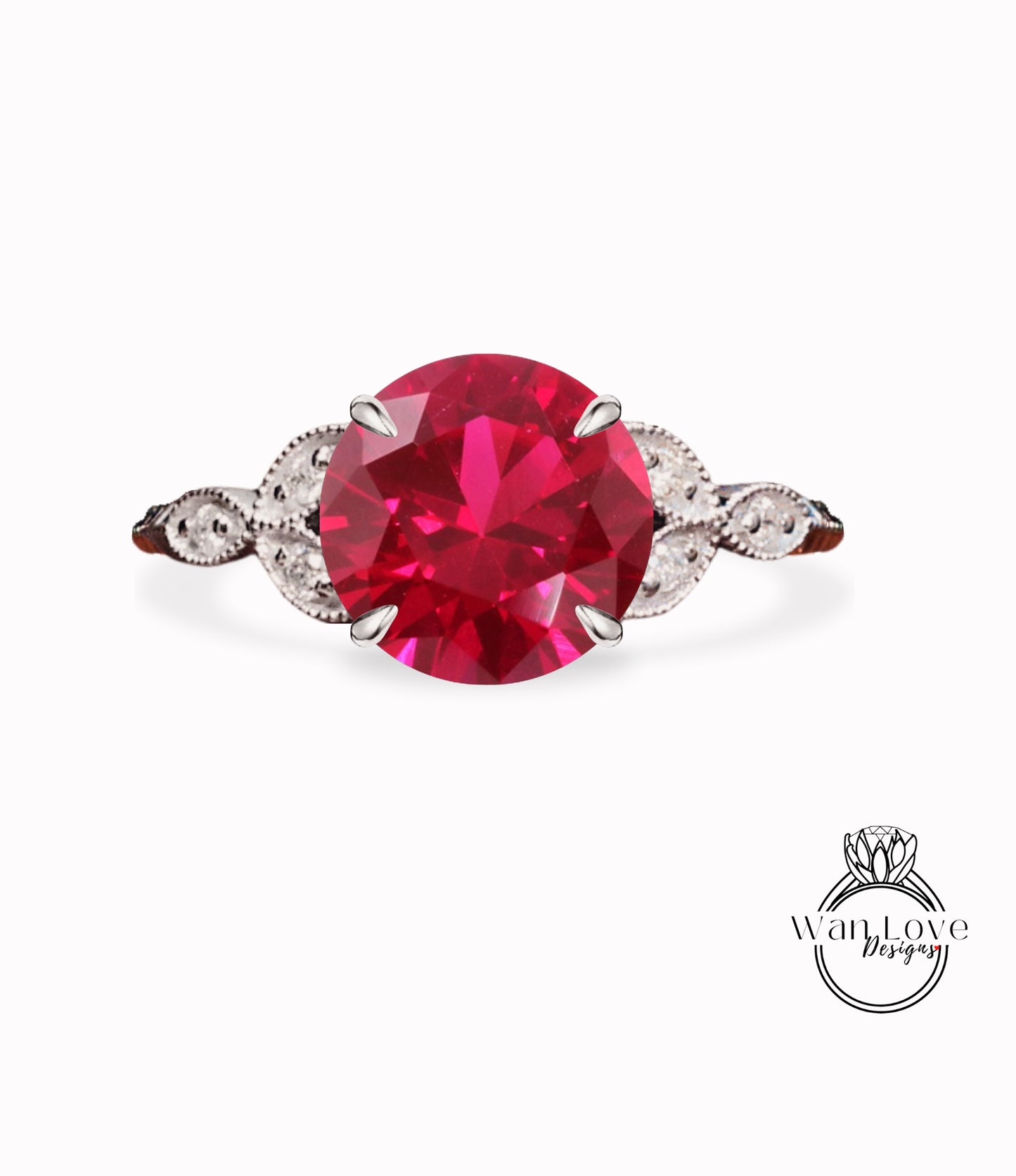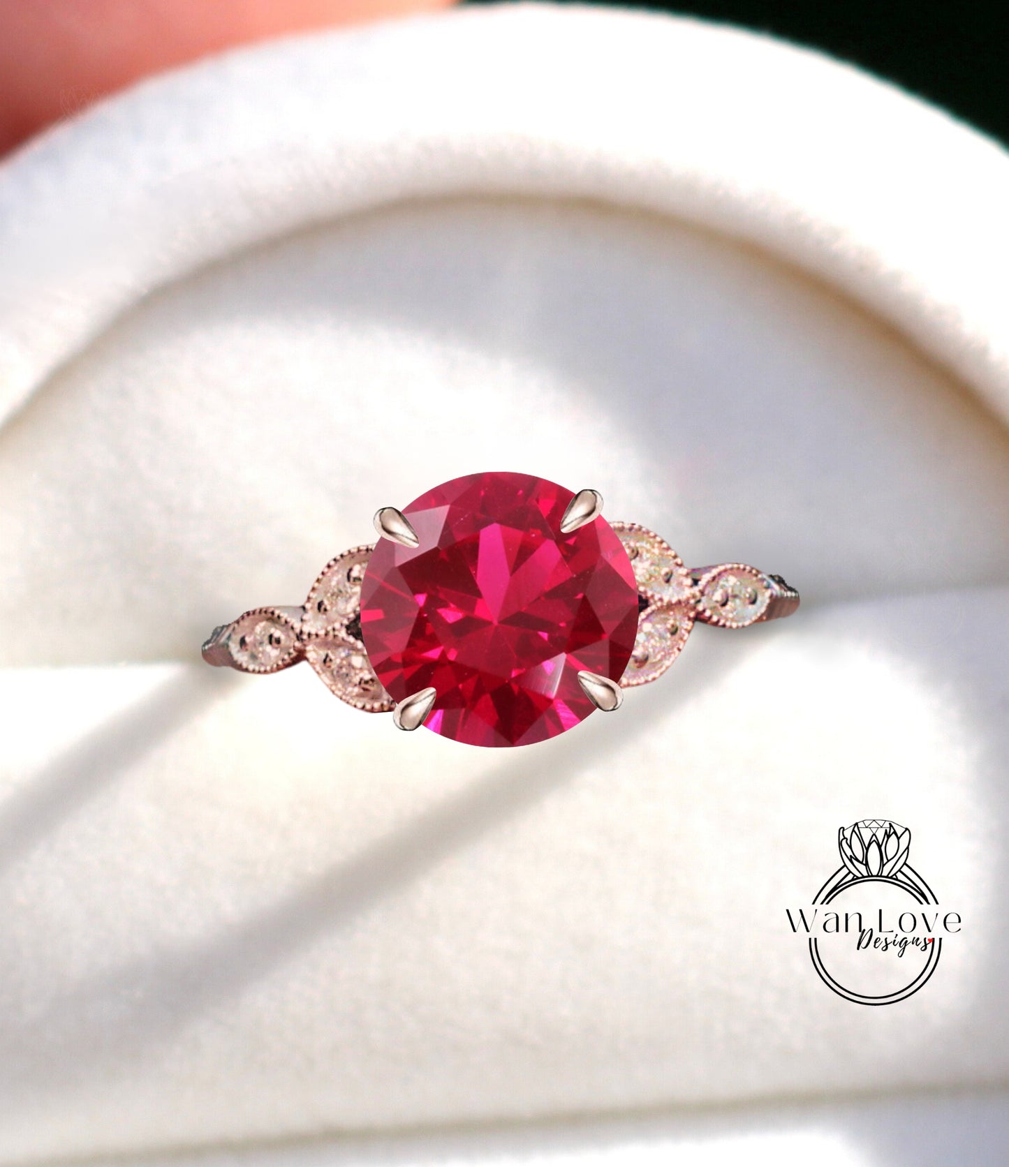 Ruby & Diamonds Round Leaf Antique Cluster Engagement Ring Engraved Milgrain or Smooth 14kt 18kt Gold Platinum Custom Wedding