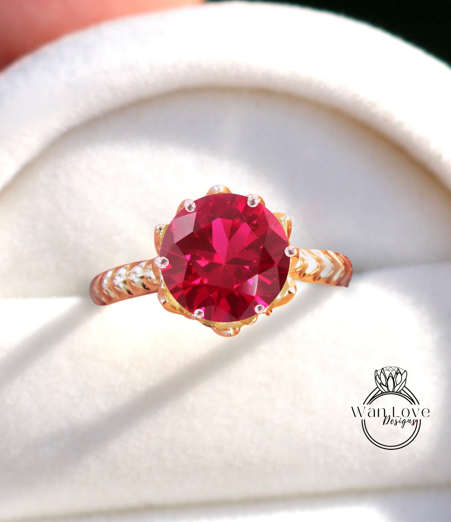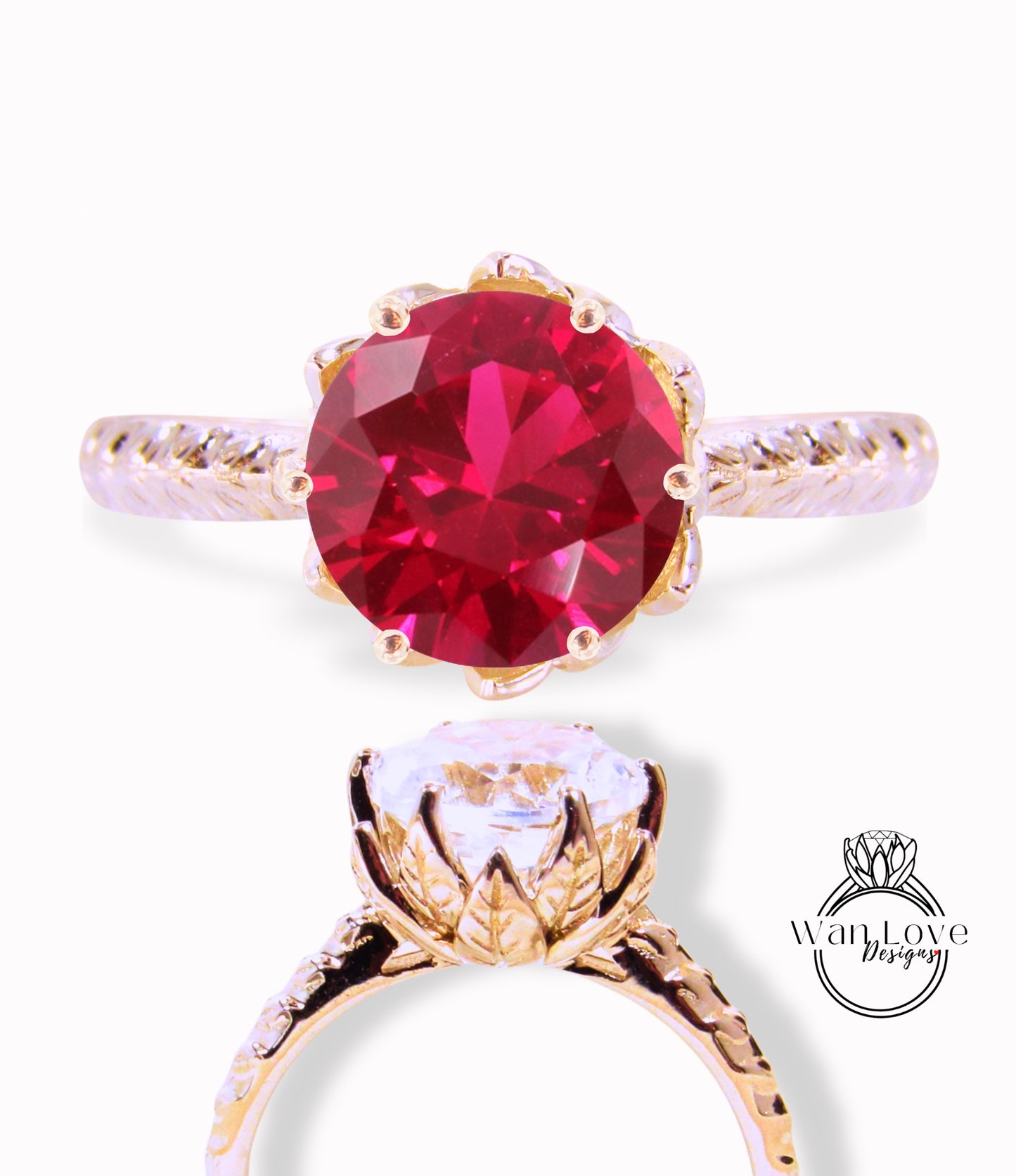 Round cut Ruby engagement ring vintage Lotus Flower engagement ring woman nature leaf ring Unique Bridal ring Anniversary gift