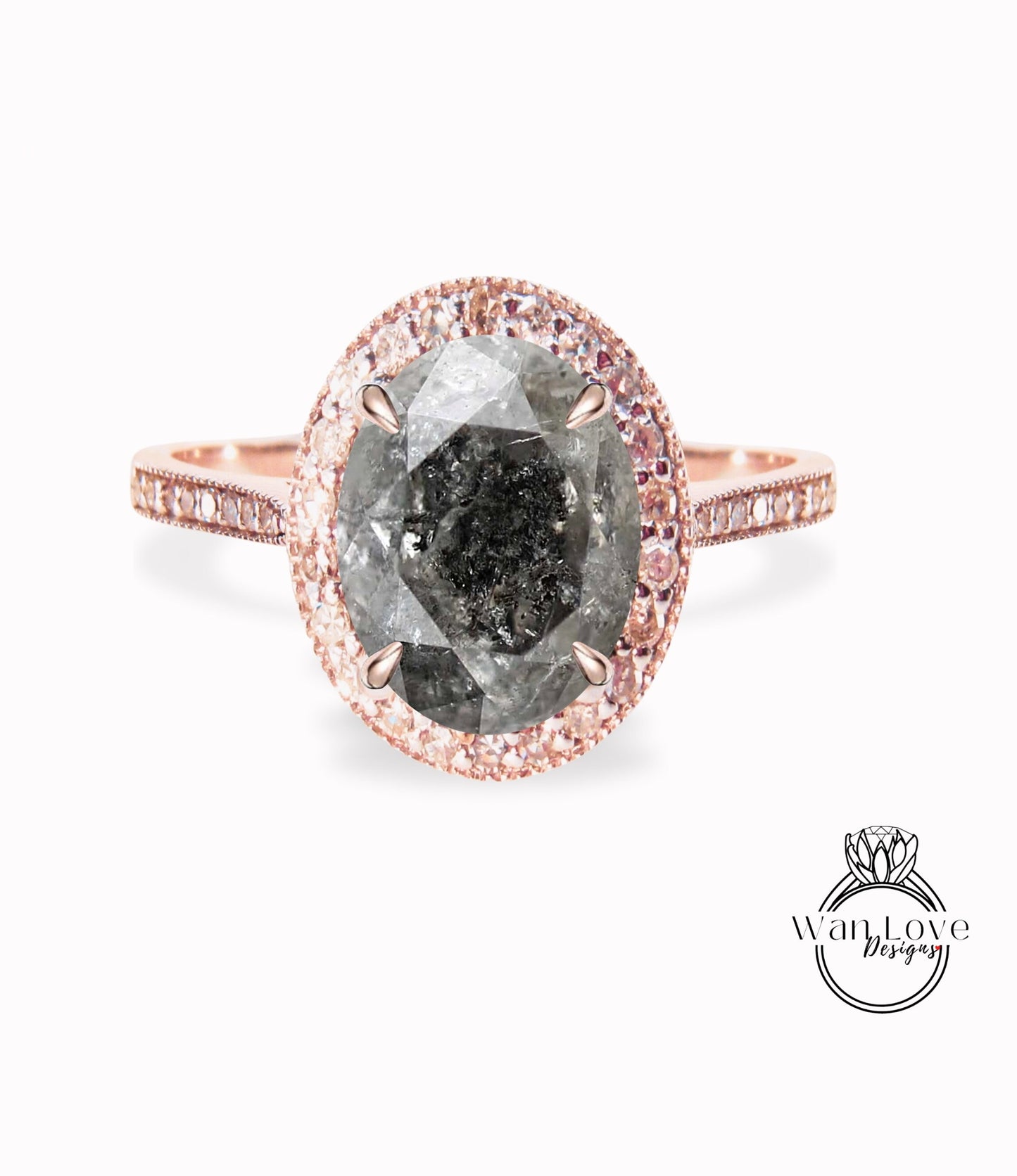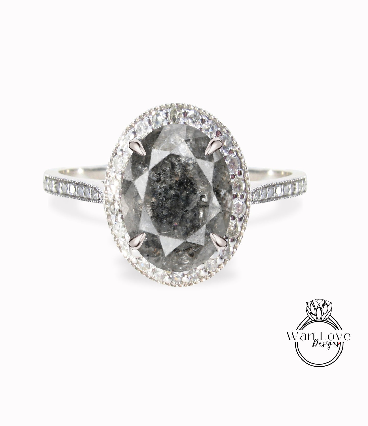 Salt & Pepper Diamond 14k gold milgrain oval halo engagement ring, diamond gold engagement ring, gold milgrain ring, vintage inspired