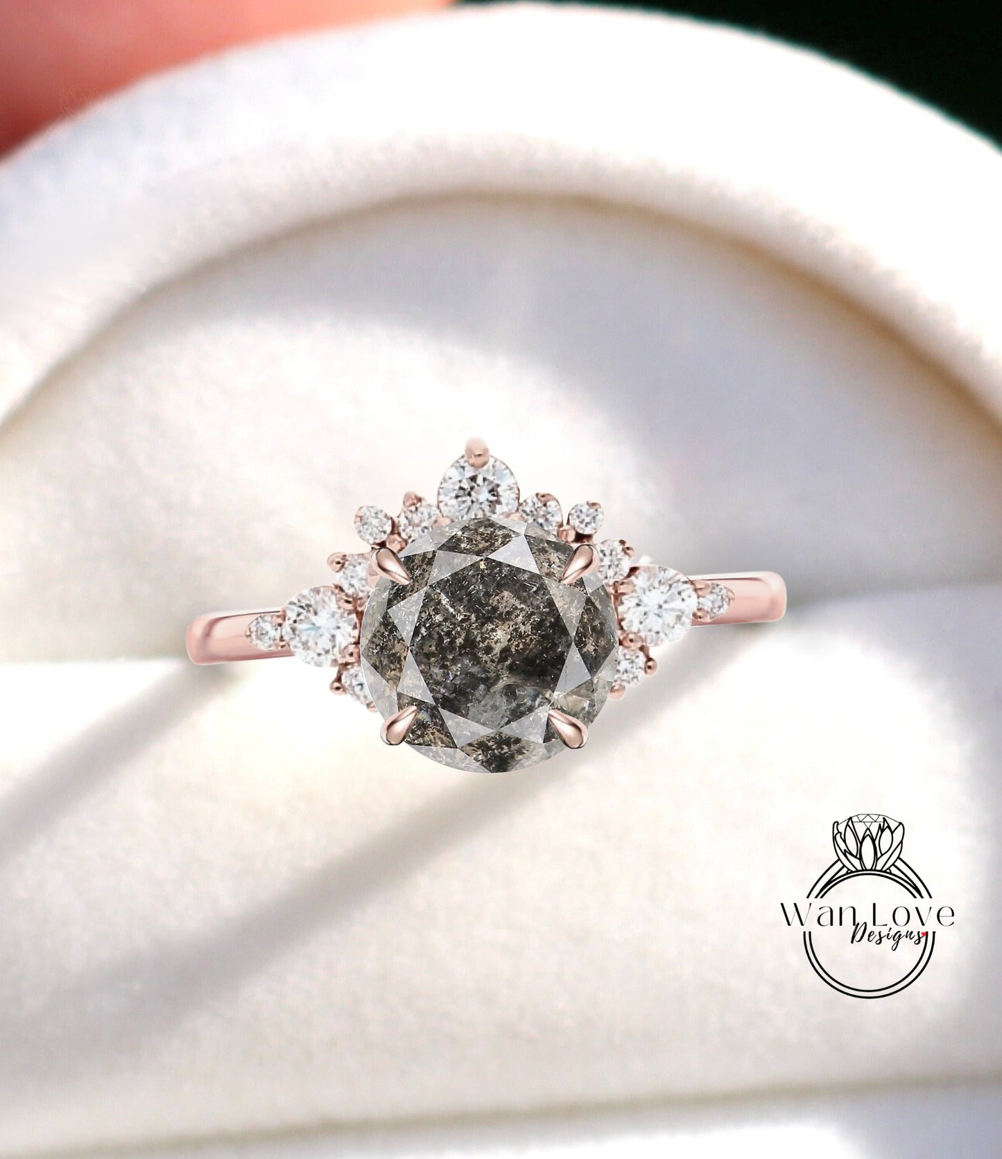 Salt & Pepper Diamond Cluster Half Halo engagement ring Diamonds Unique cluster round cut White Rose Gold Ring woman Promise Anniversary Gift