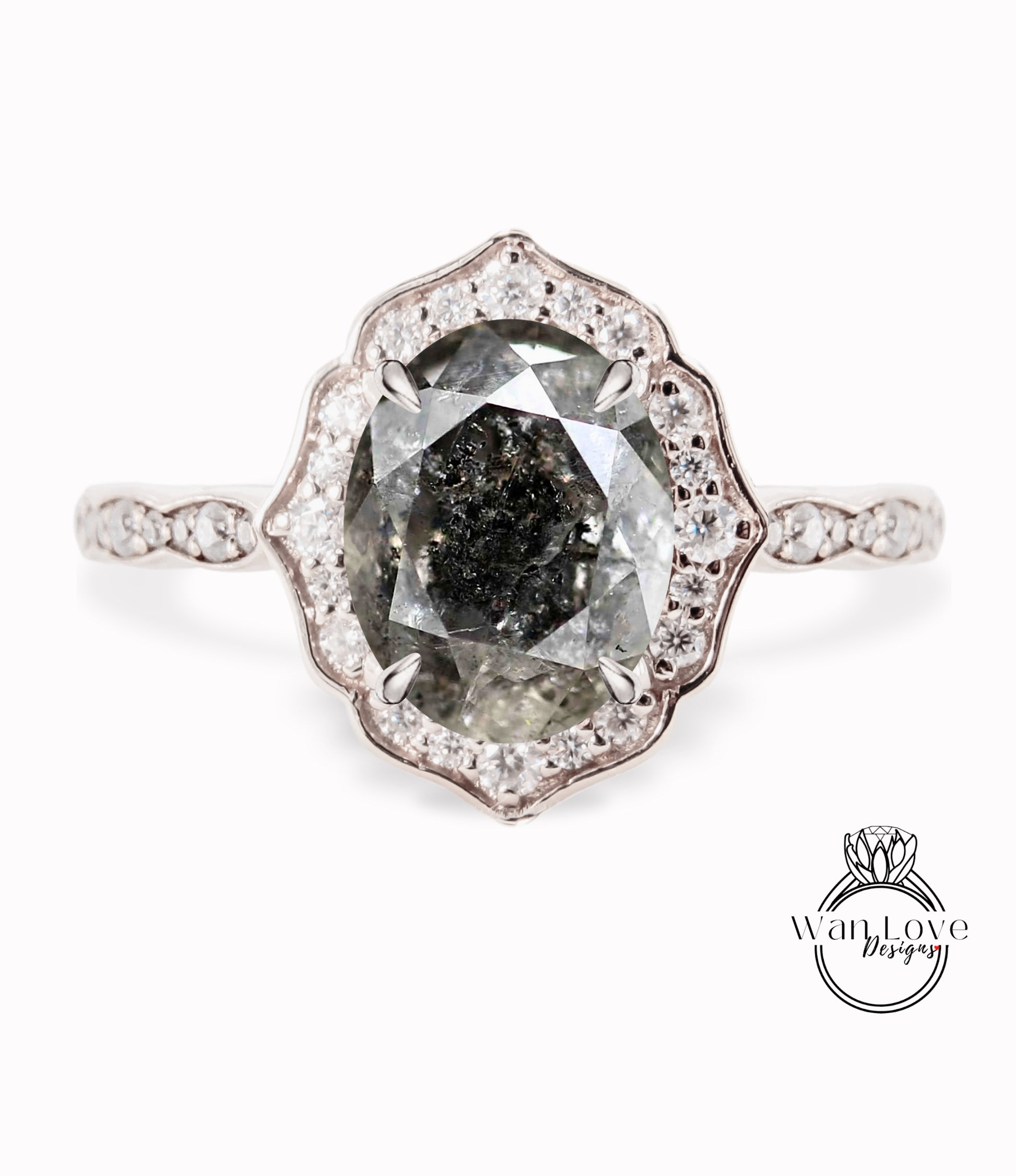 Salt & Pepper Diamond halo scalloped engagement ring unique vintage ring rose gold bridal wedding ring anniversary gift