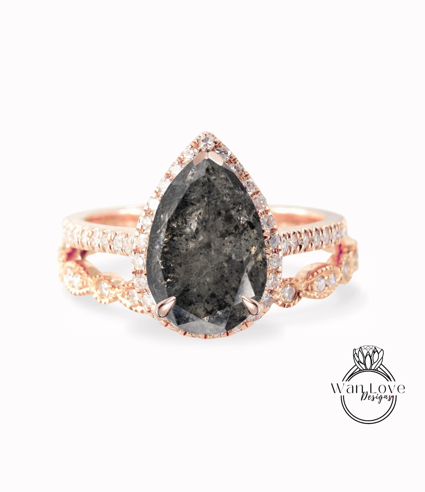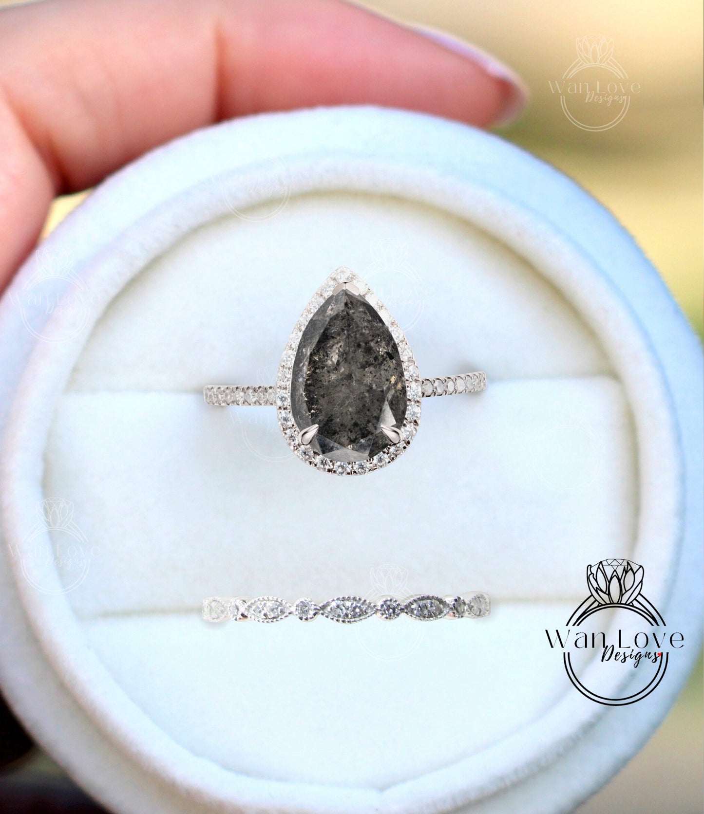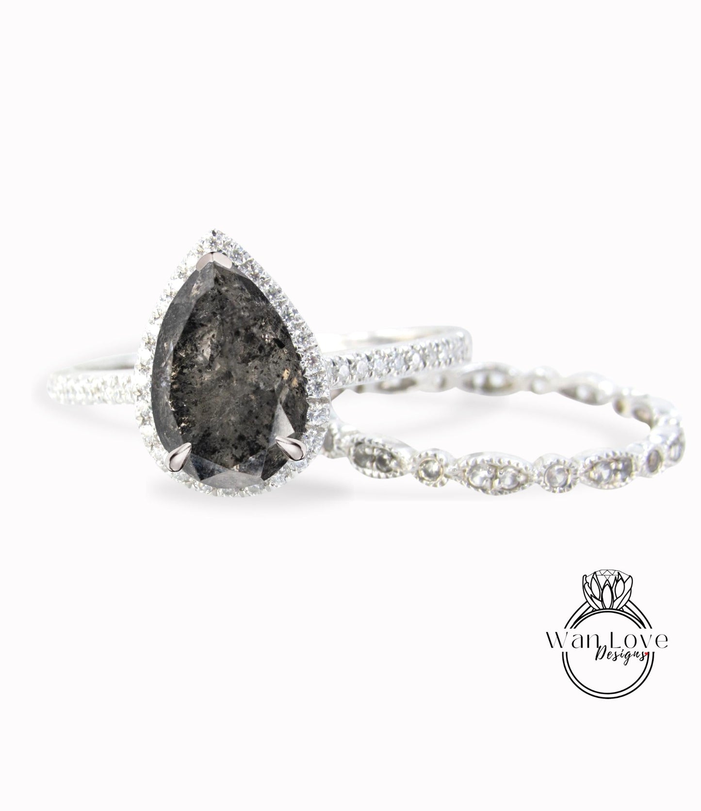 Salt & Pepper Diamond Pear Halo Engagement Ring, Half Eternity Wedding Band Set, Custom-14k 18k White Yellow Rose Gold-Platinum