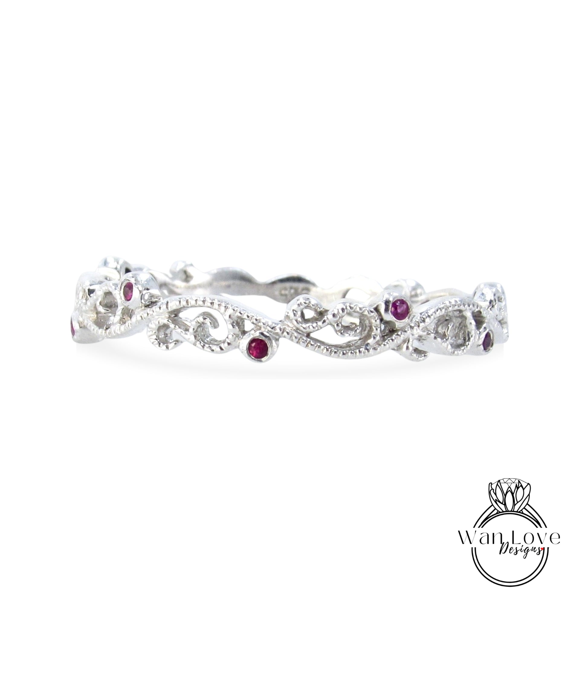 Sample Sale Ready to ship-Ruby Filigree Milgrain Swirl Wedding Band, Almost Eternity, Stackable Ring, 925 Silver w Rhodium