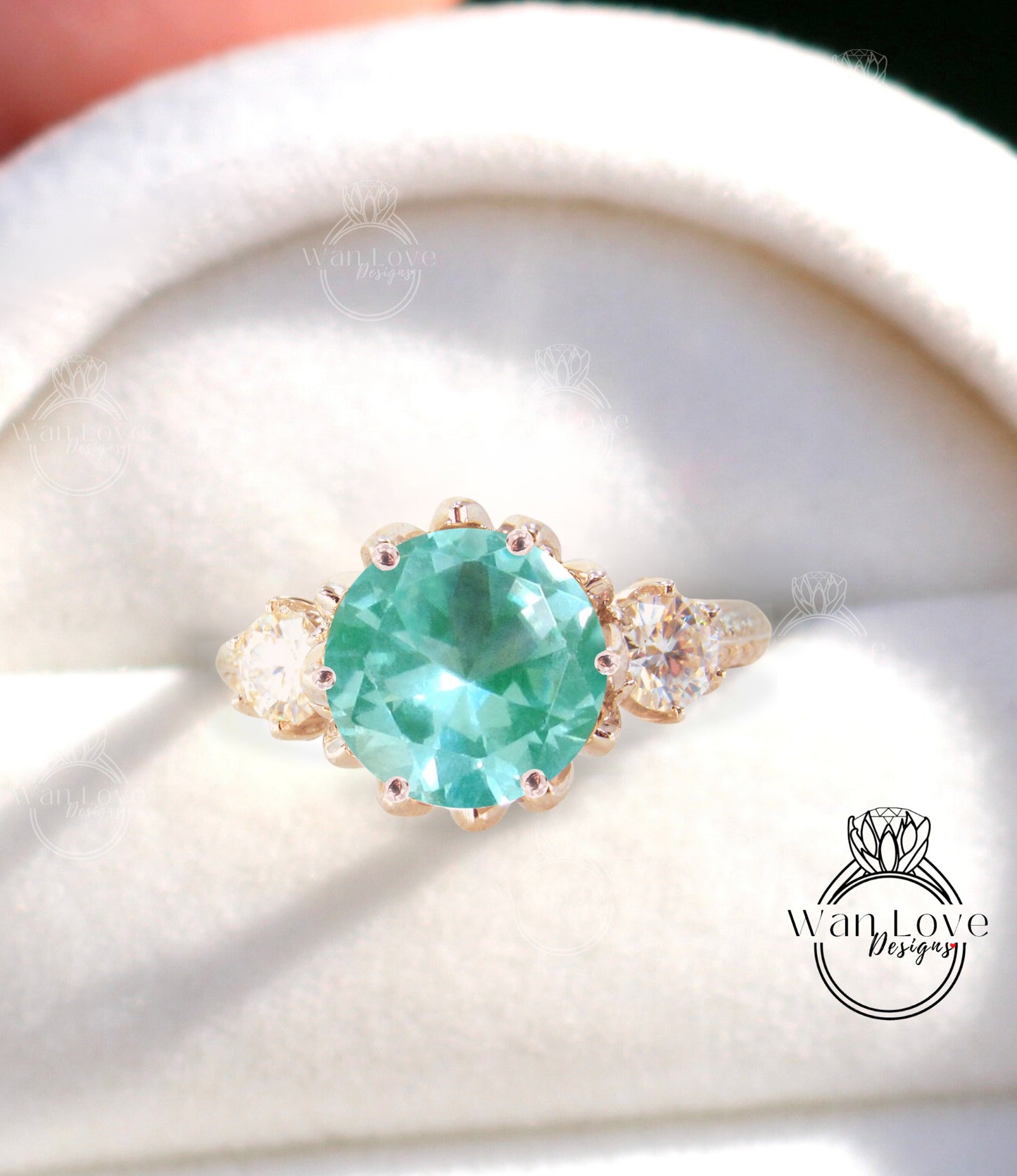 Teal Spinel & Diamond Lotus Flower 3 gemstone Engagement Ring, 14k 18k White Yellow Rose Gold-Platinum-Custom-Three gem stone Bridal Wedding Ring-Anniversary Gift