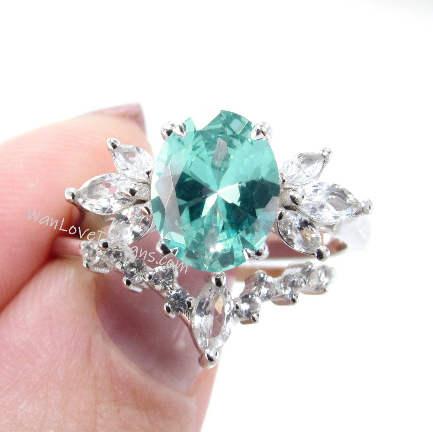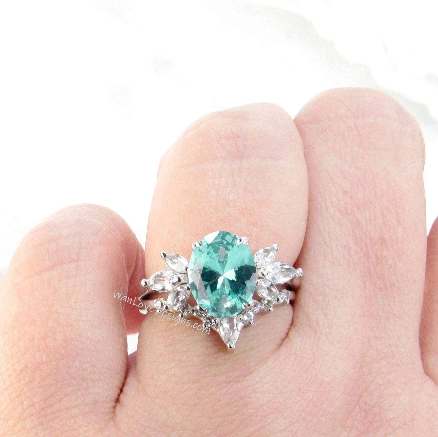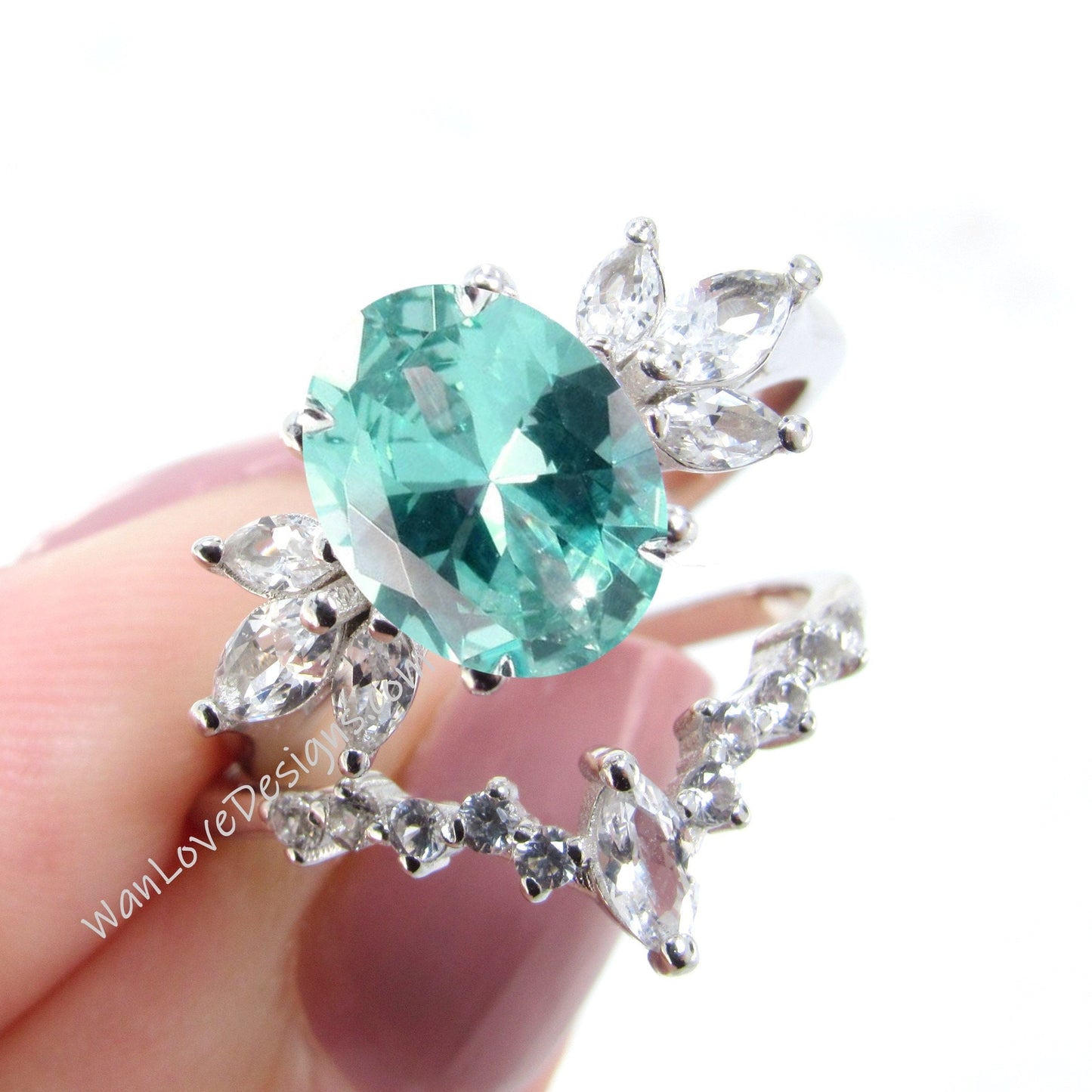 Teal Spinel Ring, Oval Floral Spinel Ring, Side Moissanite Ring, Mint Spinel Engagement Ring, Marquise Moissanite Ring