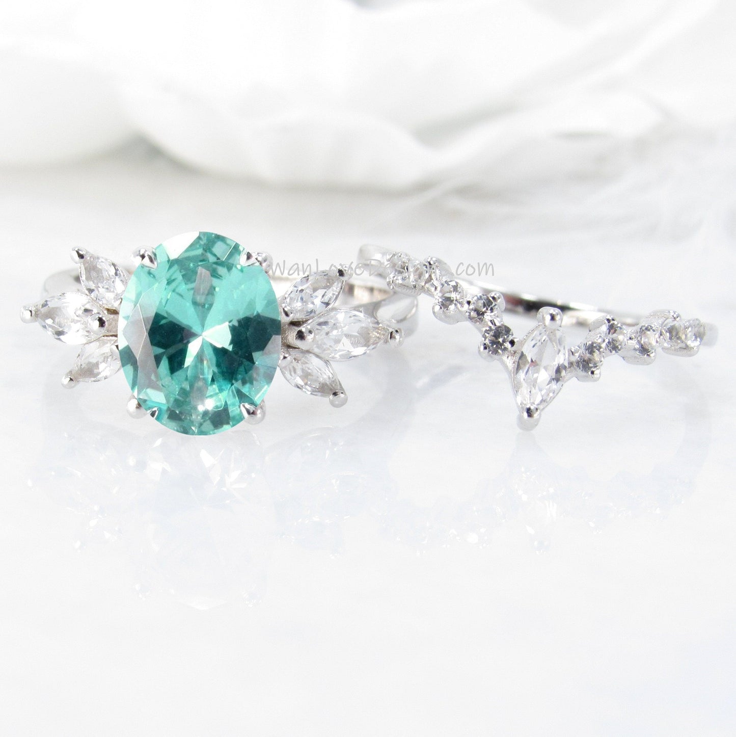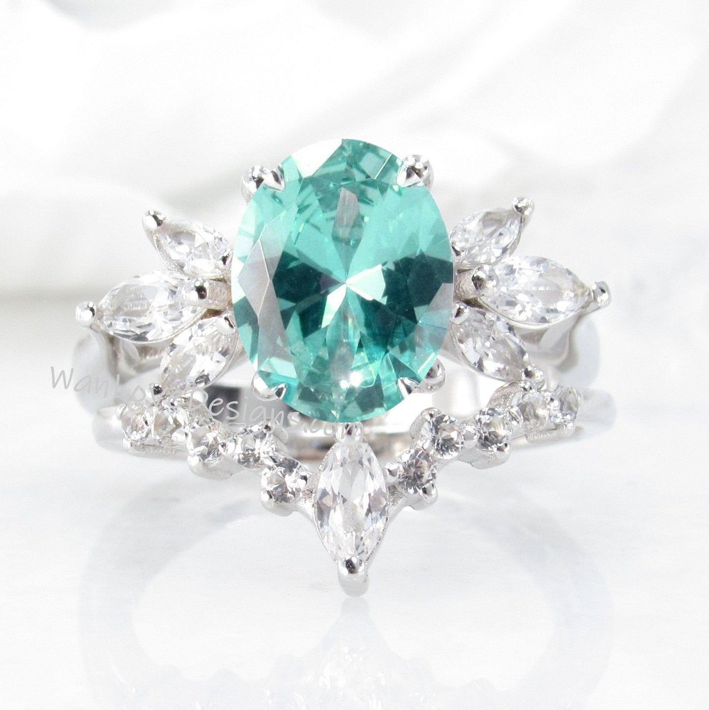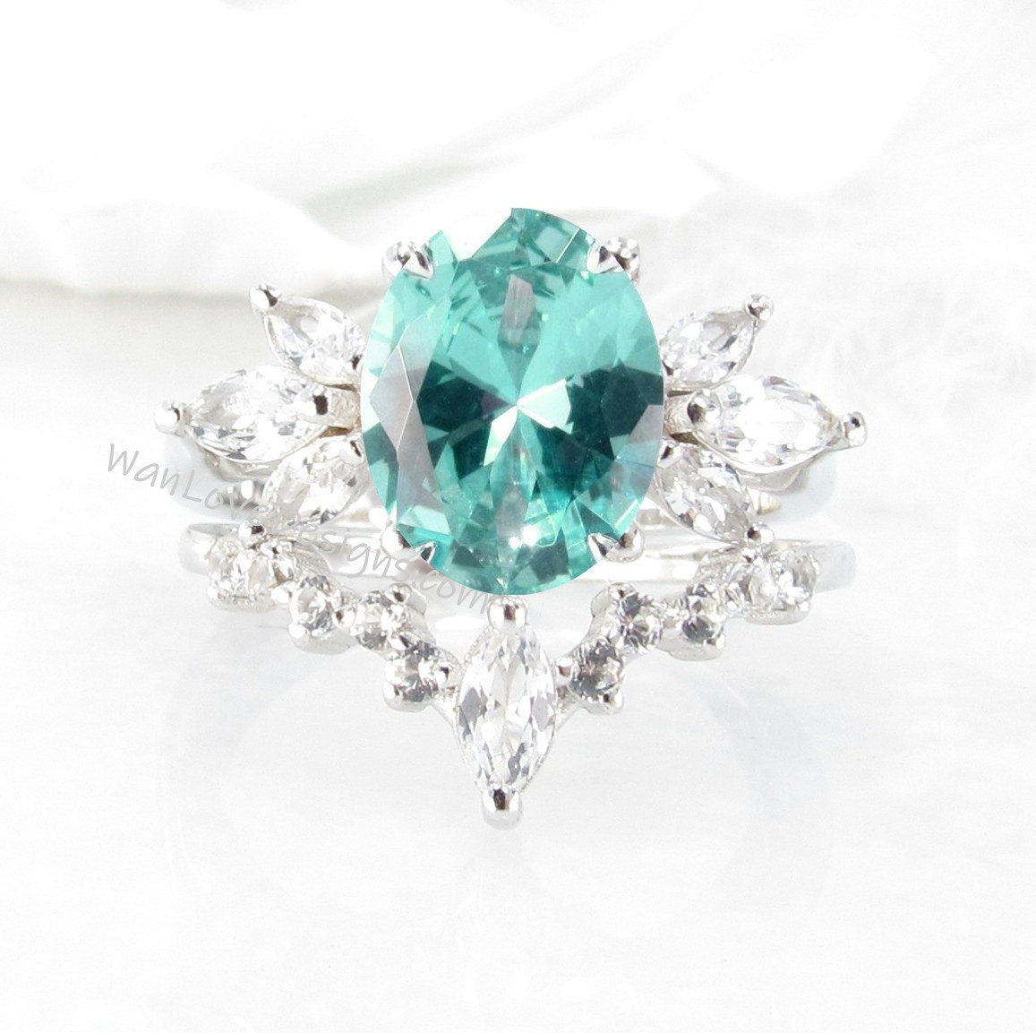 Teal Spinel Ring, Oval Floral Spinel Ring, Side Moissanite Ring, Mint Spinel Engagement Ring, Marquise Moissanite Ring