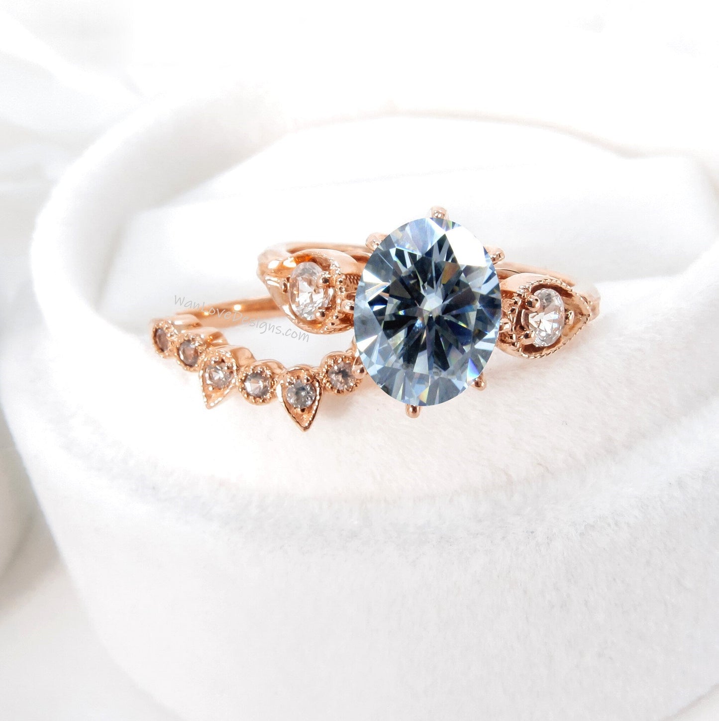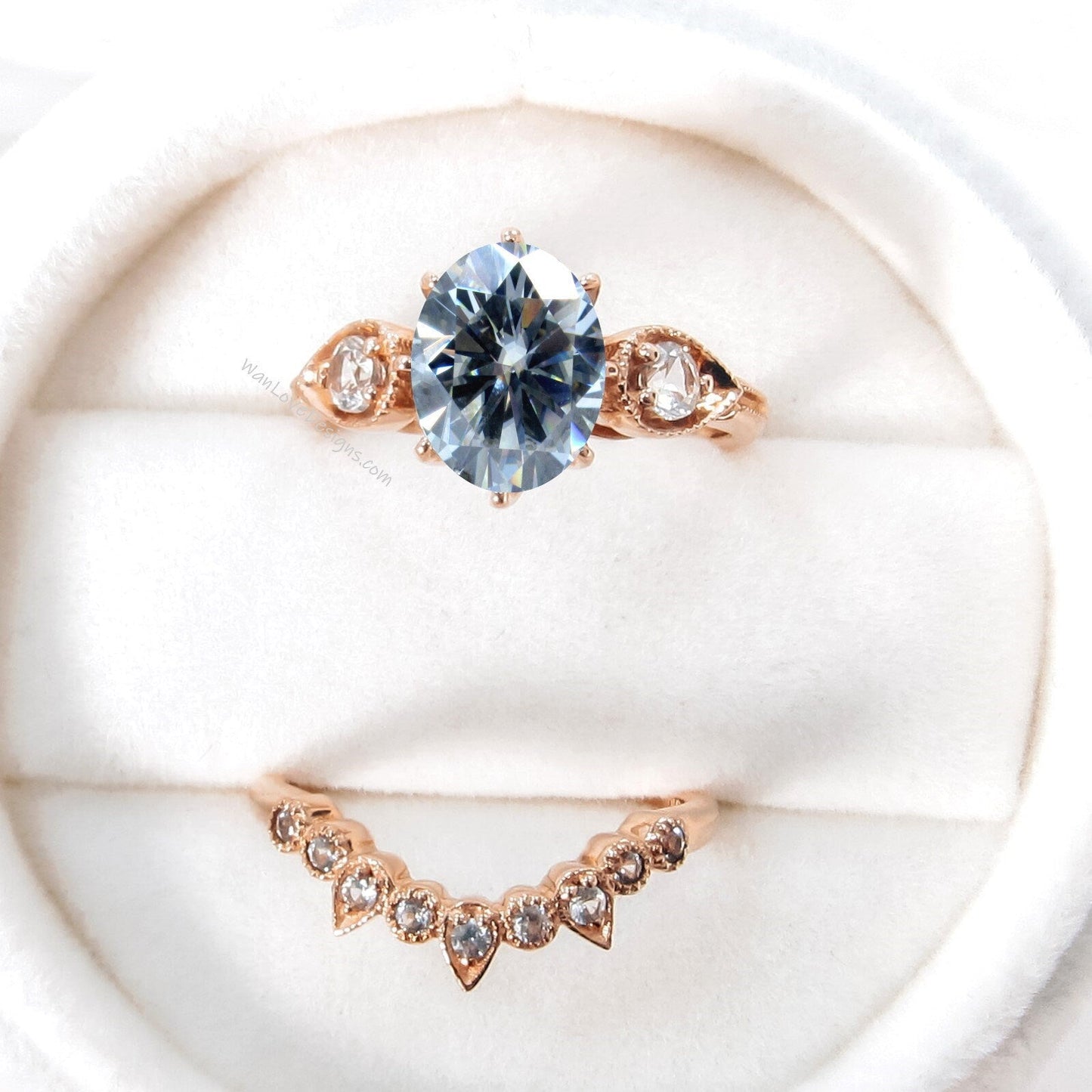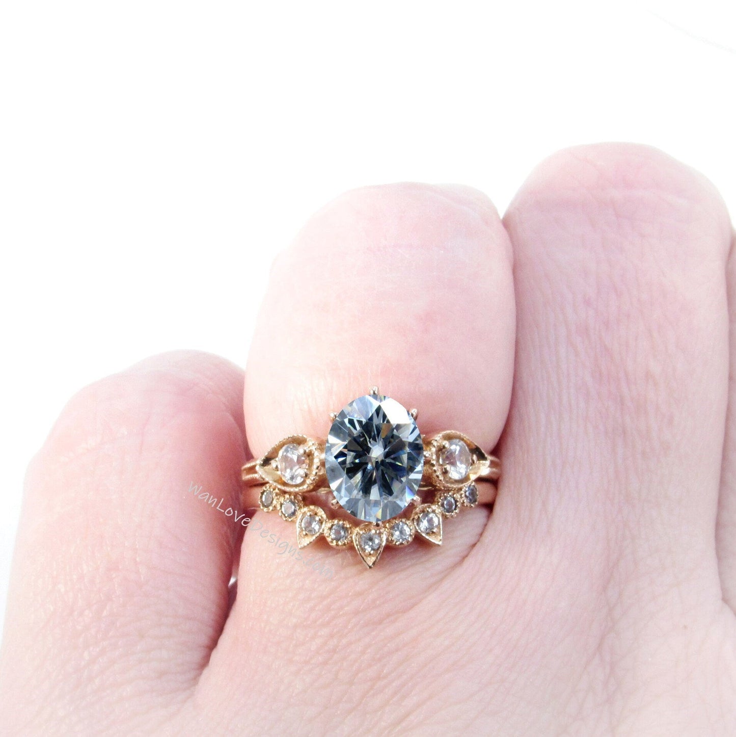 Unique Oval Shaped Gray Moissanite Engagement Ring Boho Bridal Ring Set U Shaped Wedding Band Solid 14k Rose Gold Alternative Wedding Ring