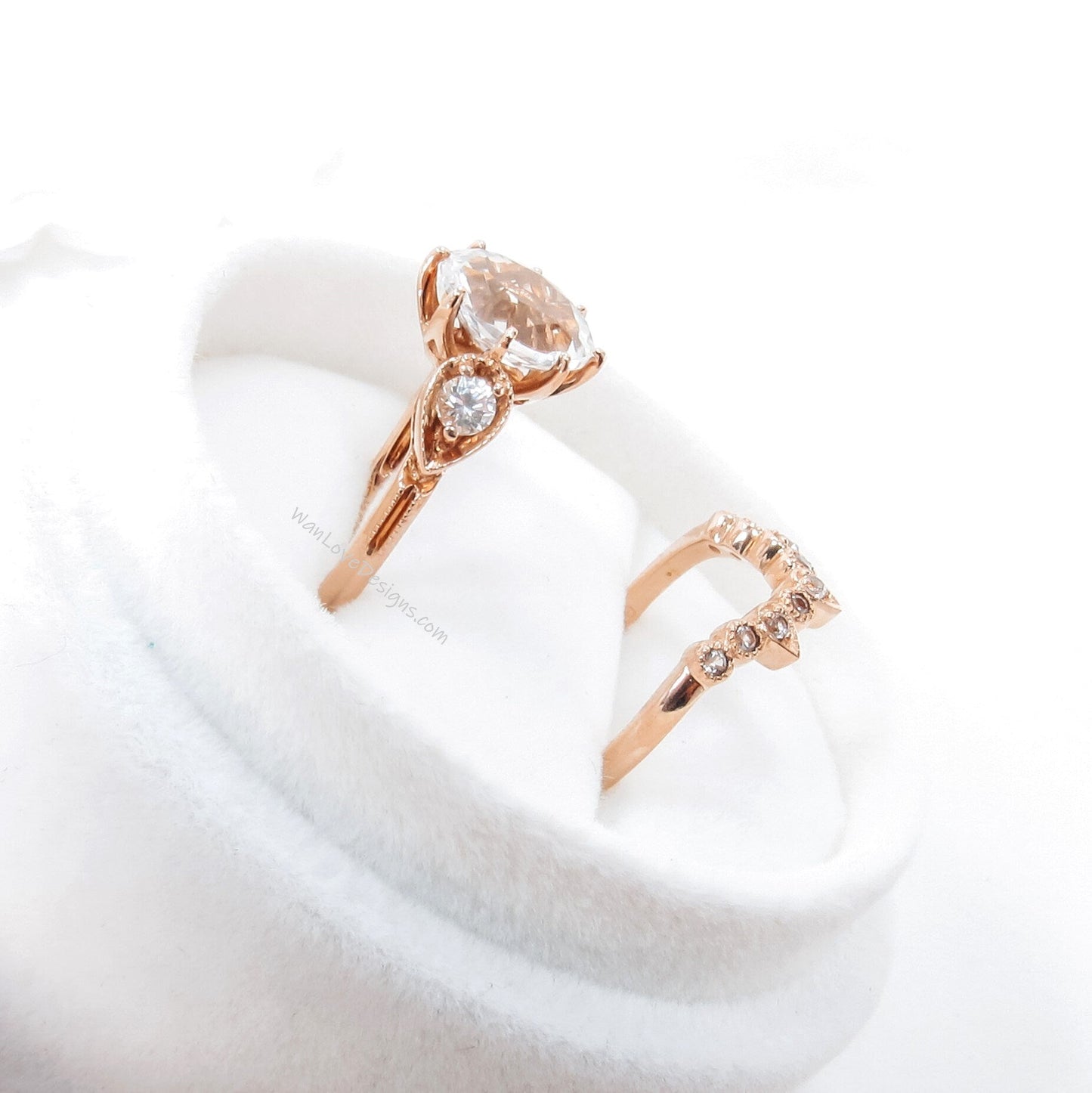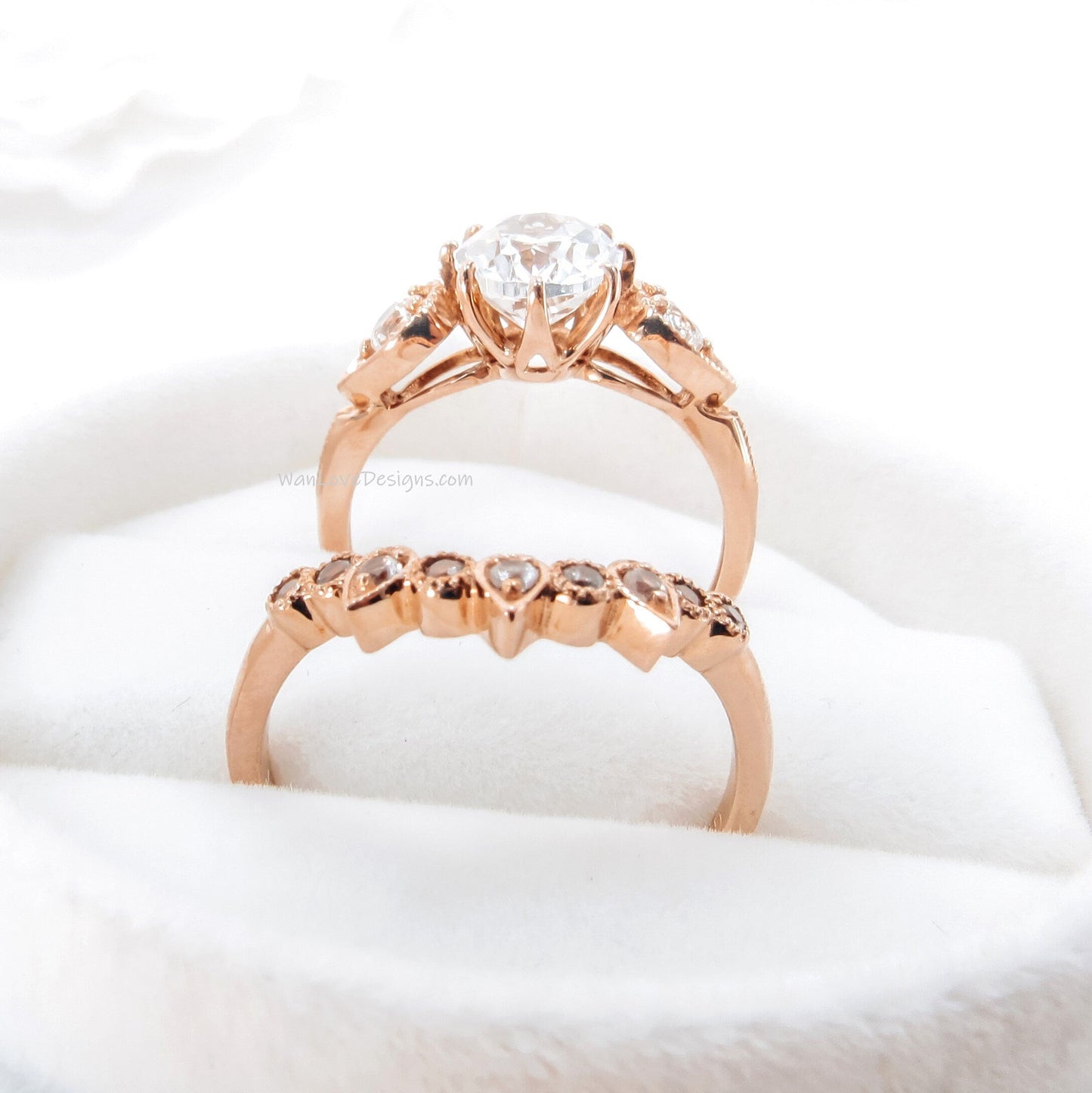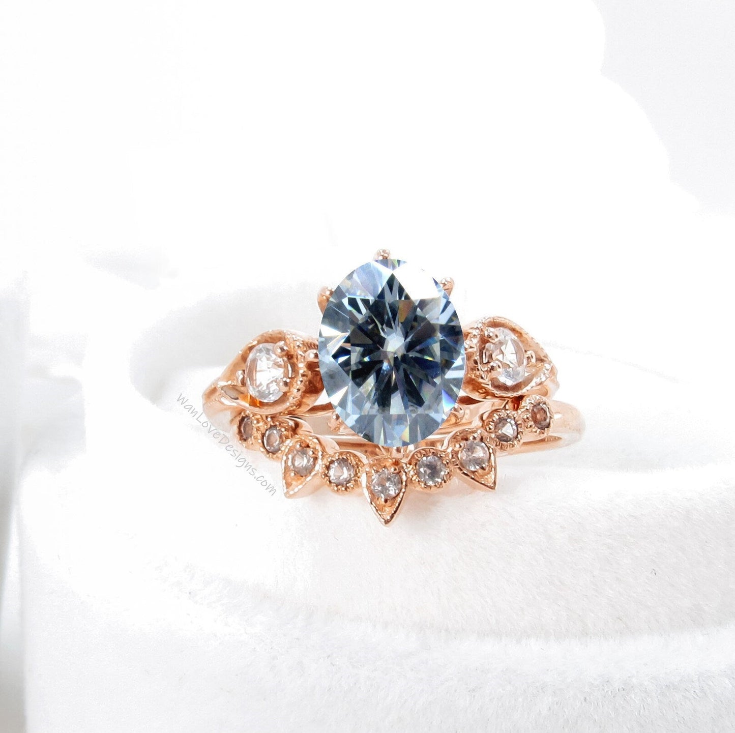 Unique Oval Shaped Gray Moissanite Engagement Ring Boho Bridal Ring Set U Shaped Wedding Band Solid 14k Rose Gold Alternative Wedding Ring