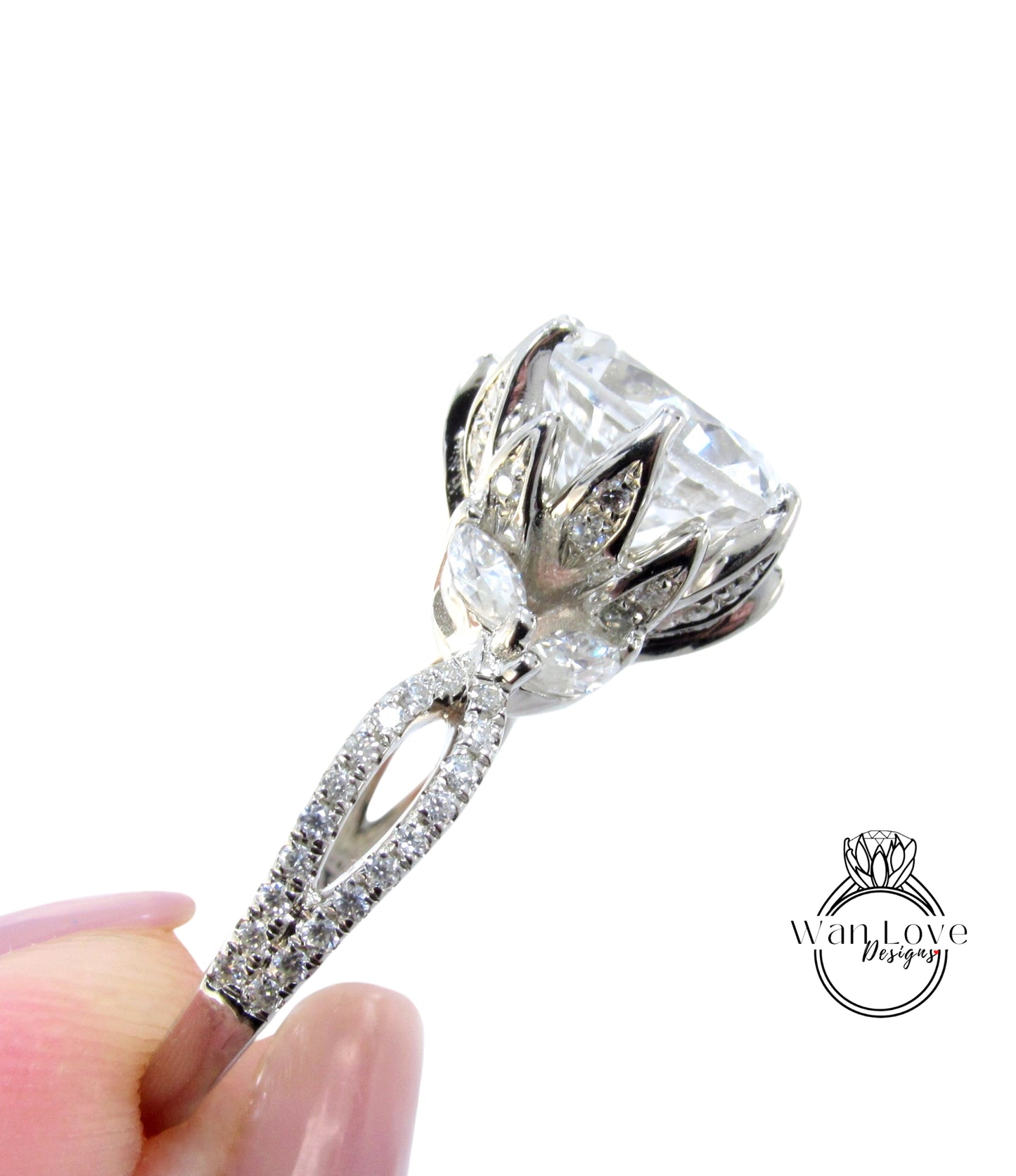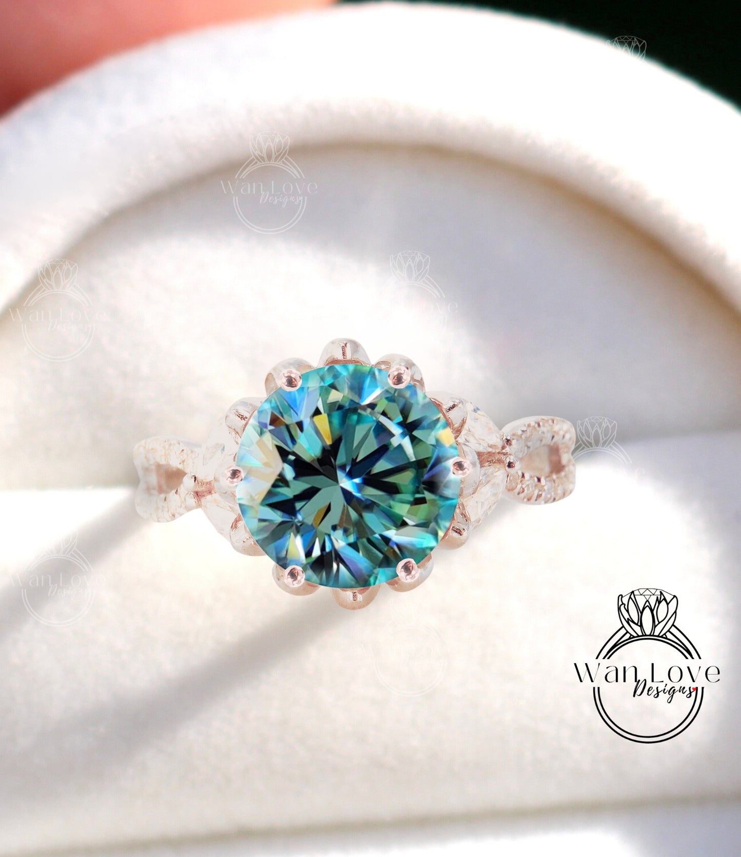 Vintage Blue Moissanite Diamond Lotus Flower Ring Marquise Leaf Split Shank Engagement Ring antique flower round ring wedding promise ring