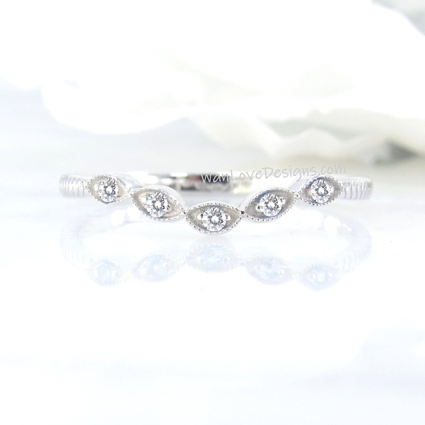 Vintage curved leaf ring, diamonds milgrain engraved antique band, womans curve moissanite ring, unique wedding ring, Birthstone Choice ring