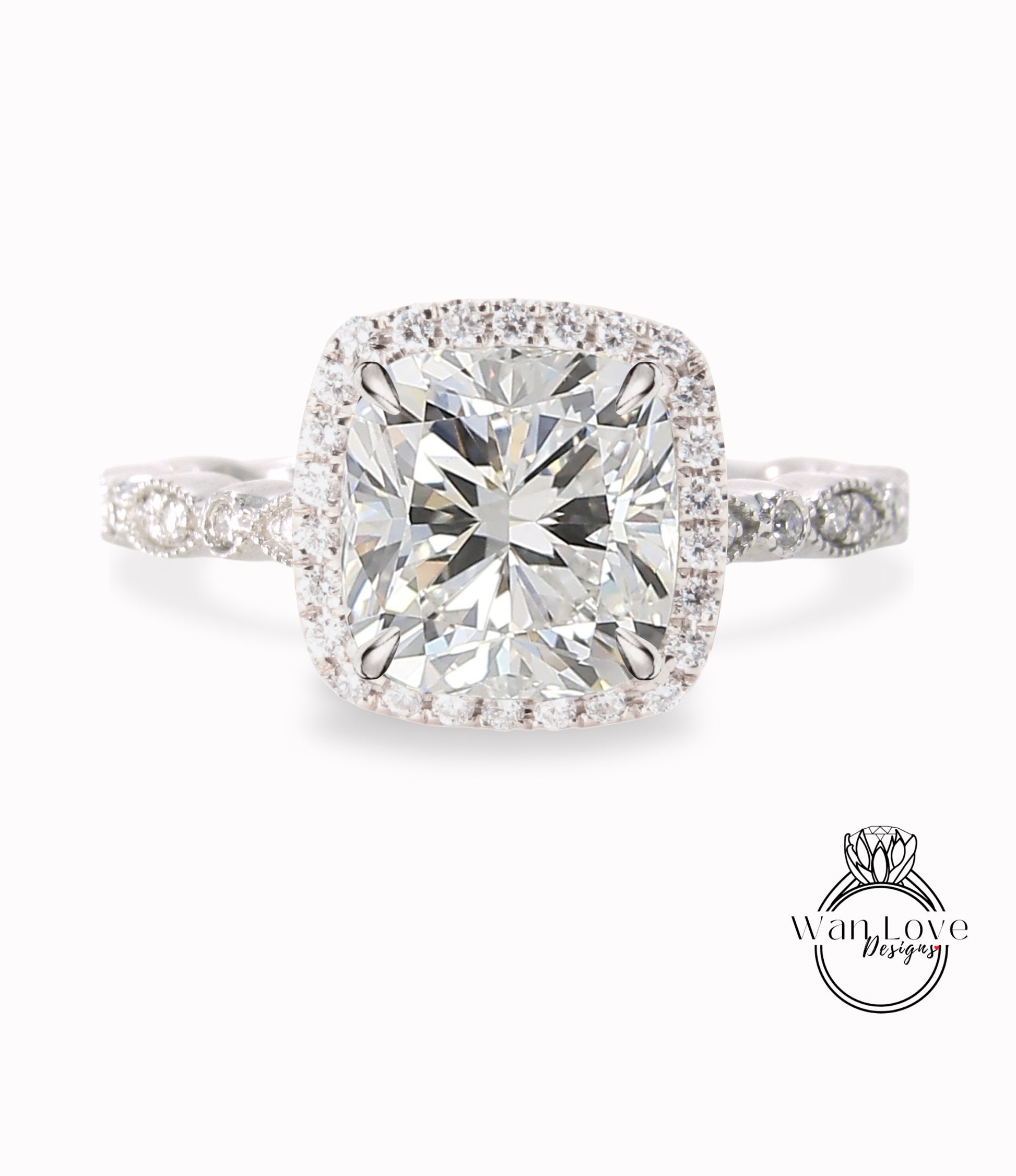 Vintage Diamond engagement ring Cushion diamond halo milgrain ring round diamond white gold diamond ring wedding ring Anniversary Gift