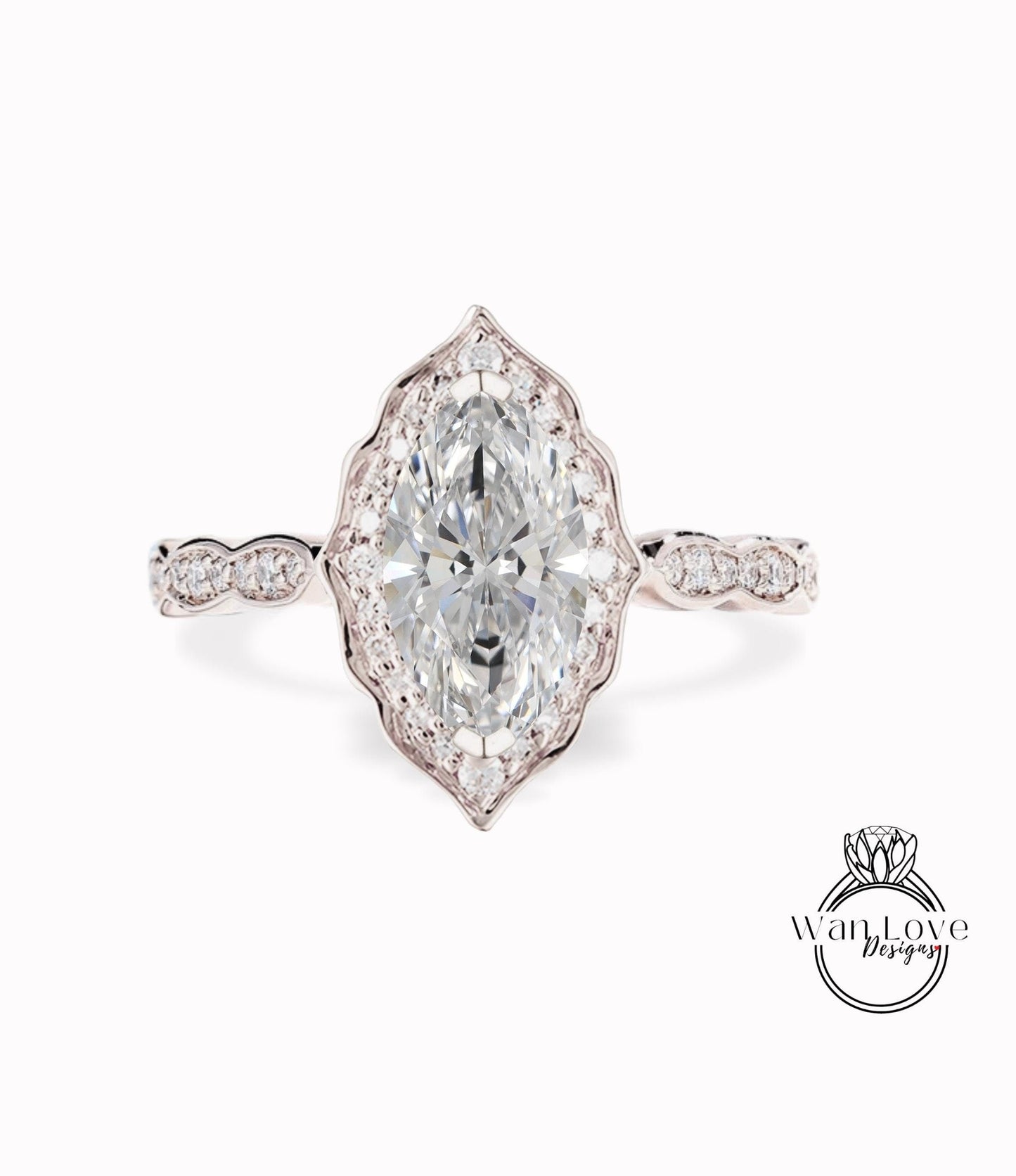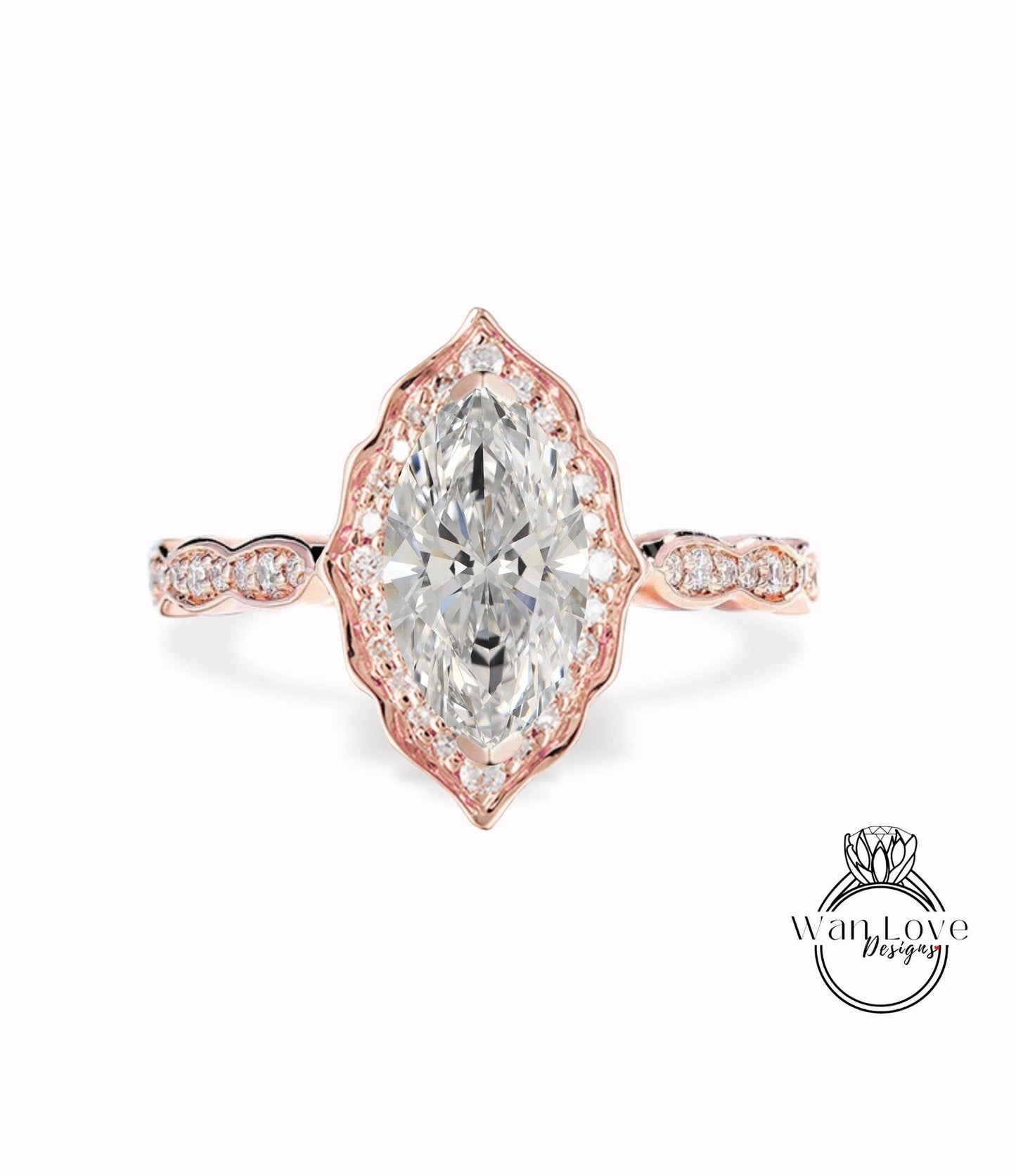 Vintage Marquise cut diamond halo engagement ring scalloped lab diamond halo ring rose gold ring art deco ring promise ring anniversary gift