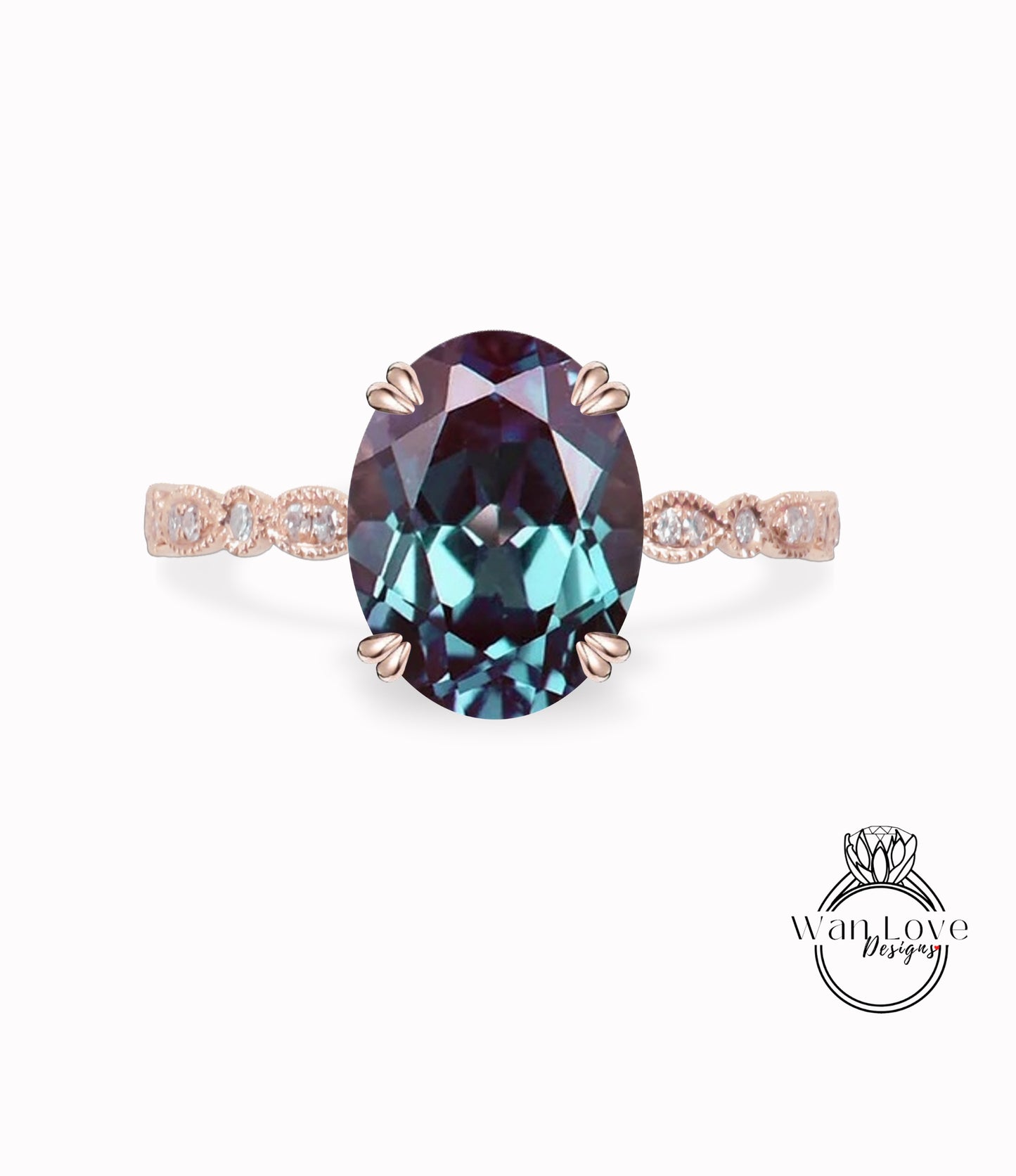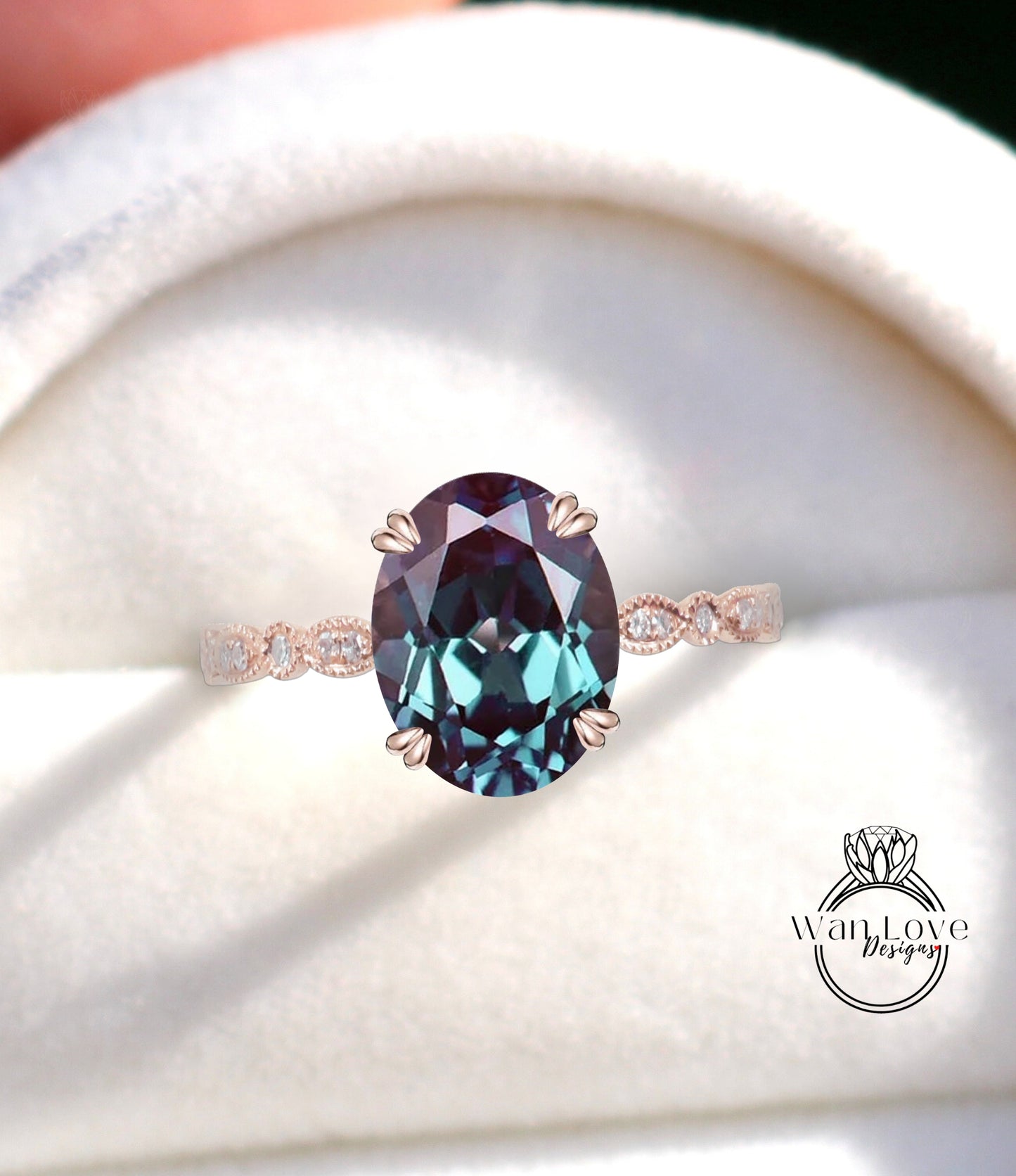 Vintage Oval cut Alexandrite engagement ring Rose gold ring Art deco Diamond Milgrain antique wedding Bridal Anniversary ring promise ring