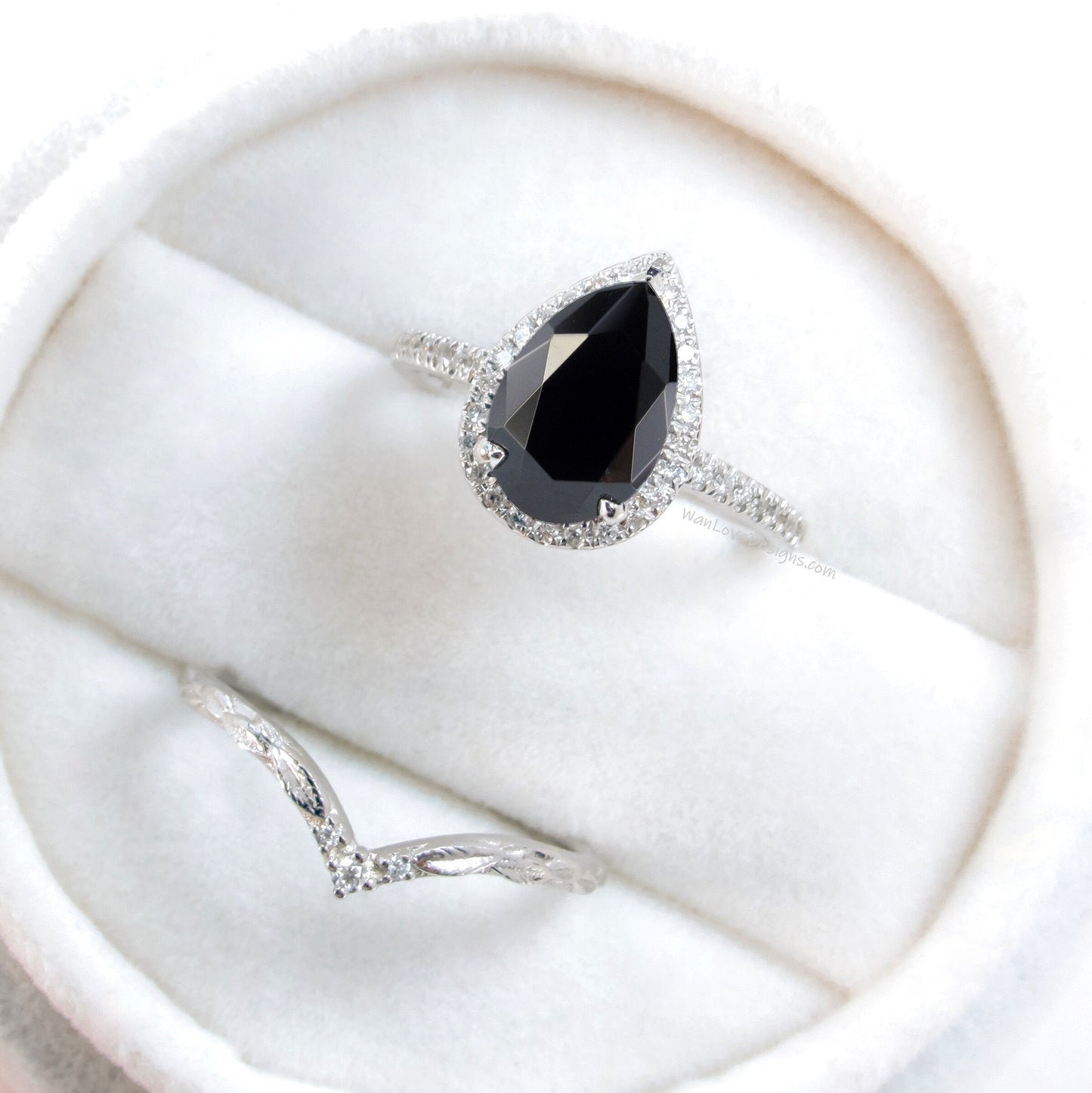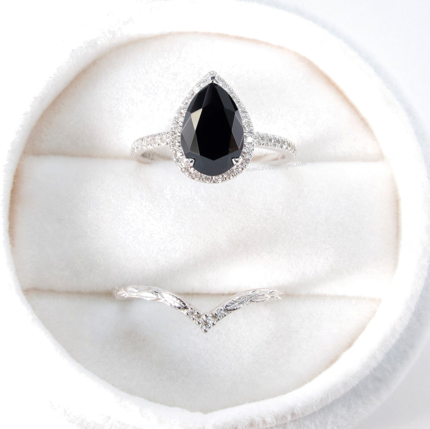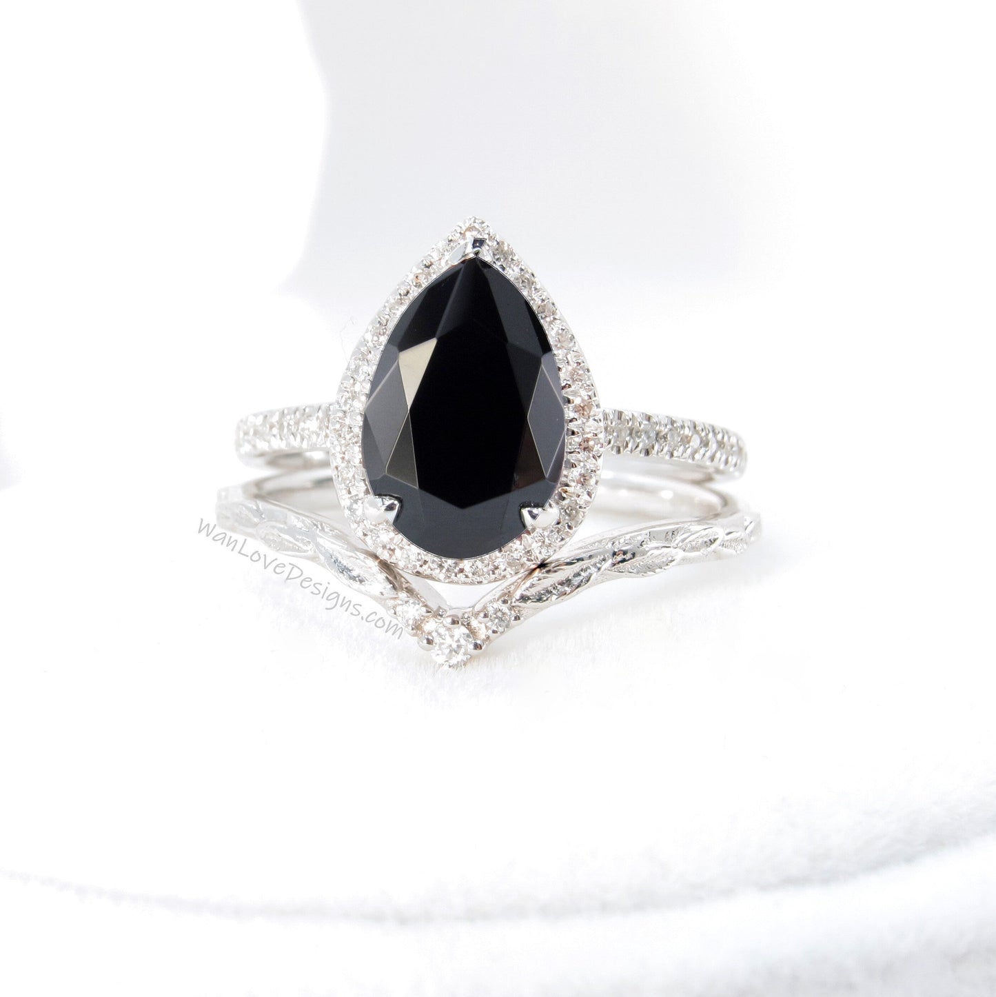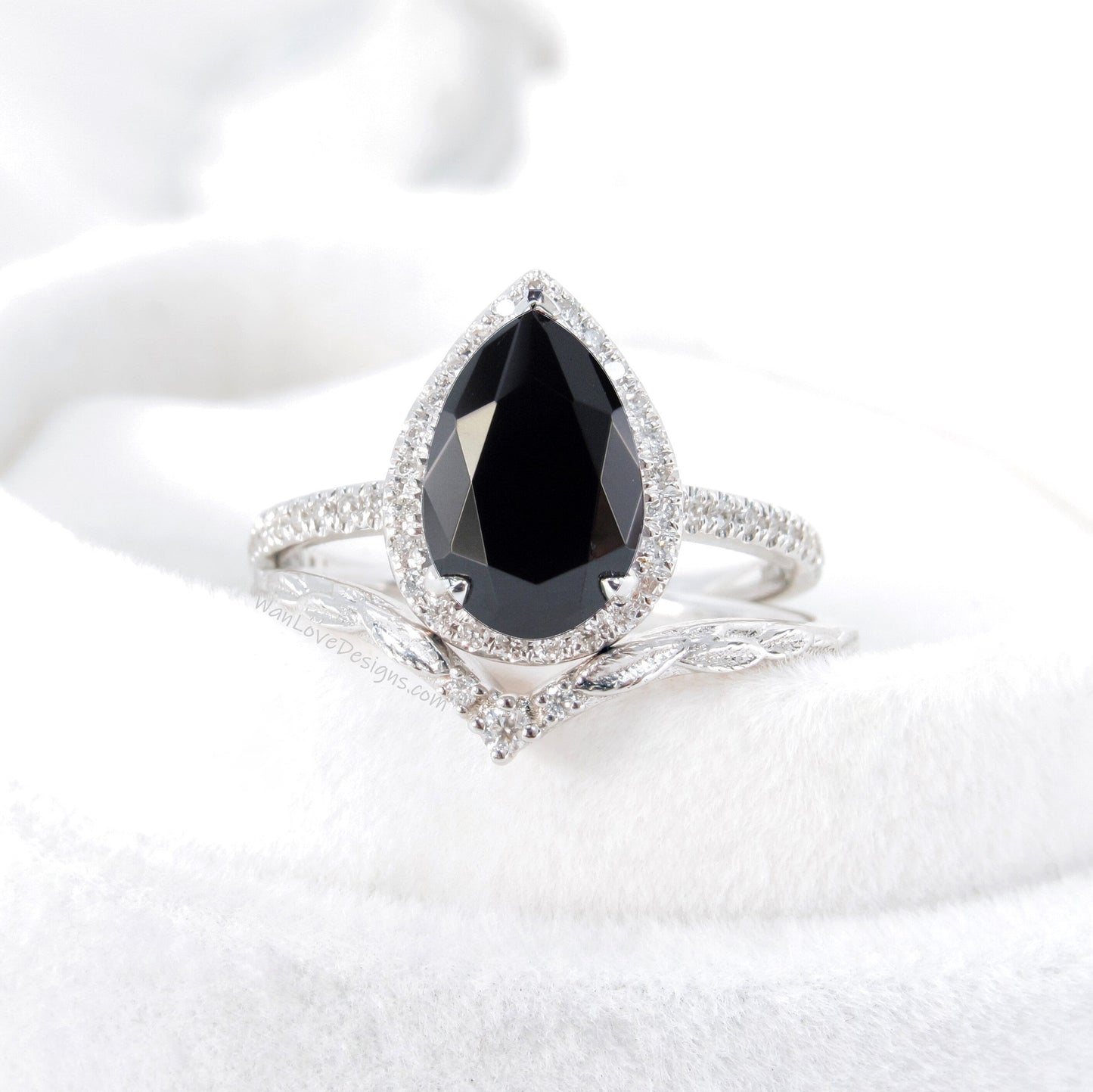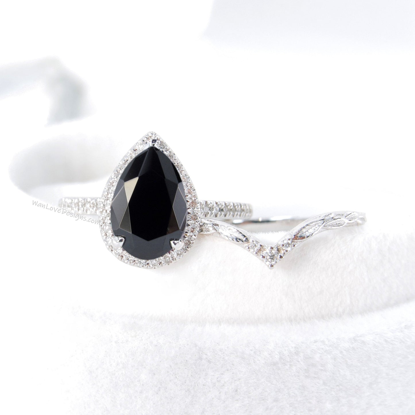 Black Spinel Diamond Halo and Curve Band Engagement Ring Set | 14K Gold Nesting Band | Leaves Bridal Ring | Nature Inspired Ring