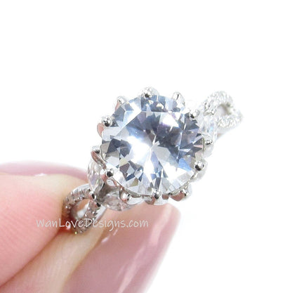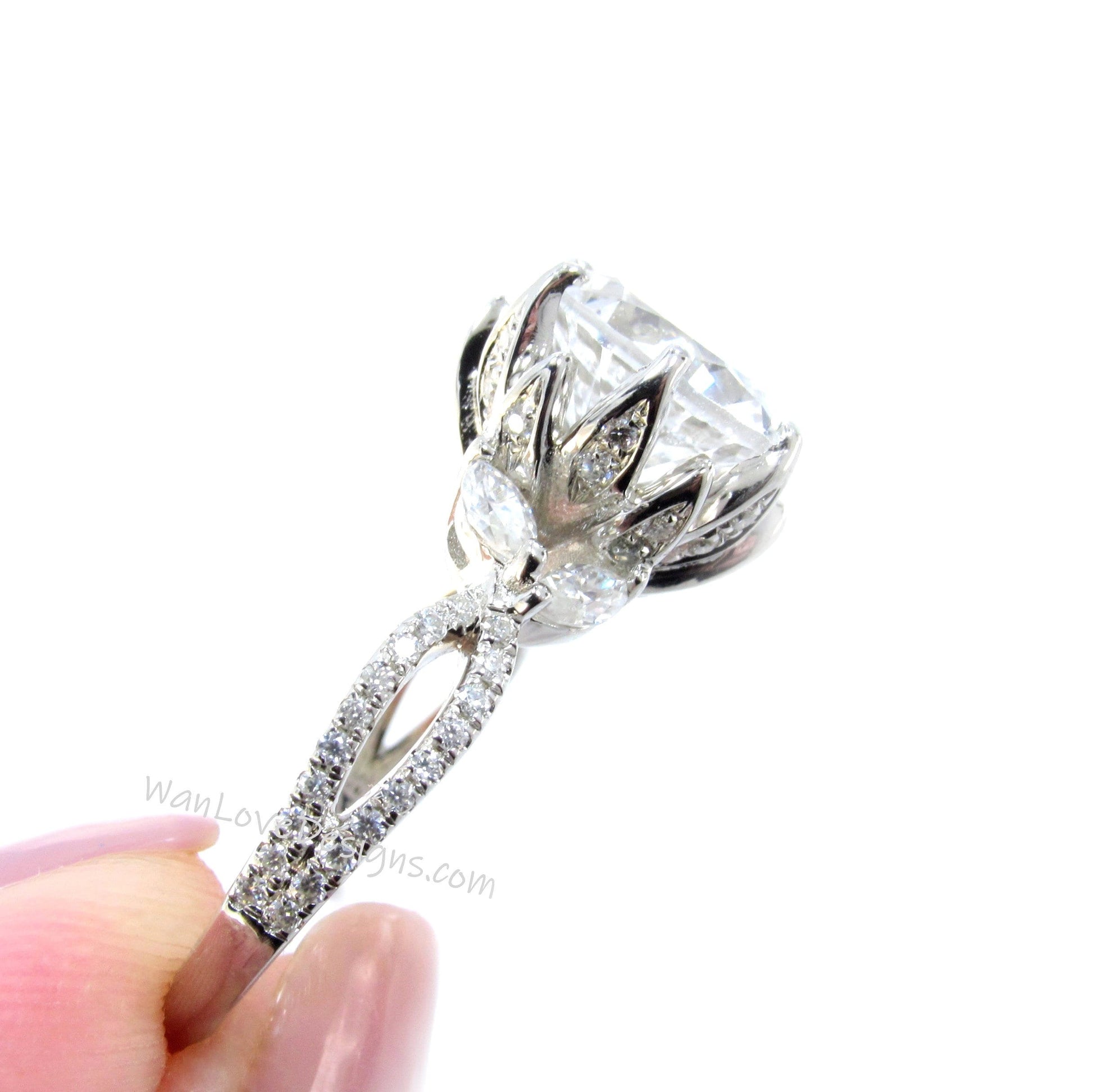 Vintage White Sapphire Diamond Lotus Flower Ring Marquise Leaf Split Shank Engagement Ring antique flower round ring wedding promise ring
