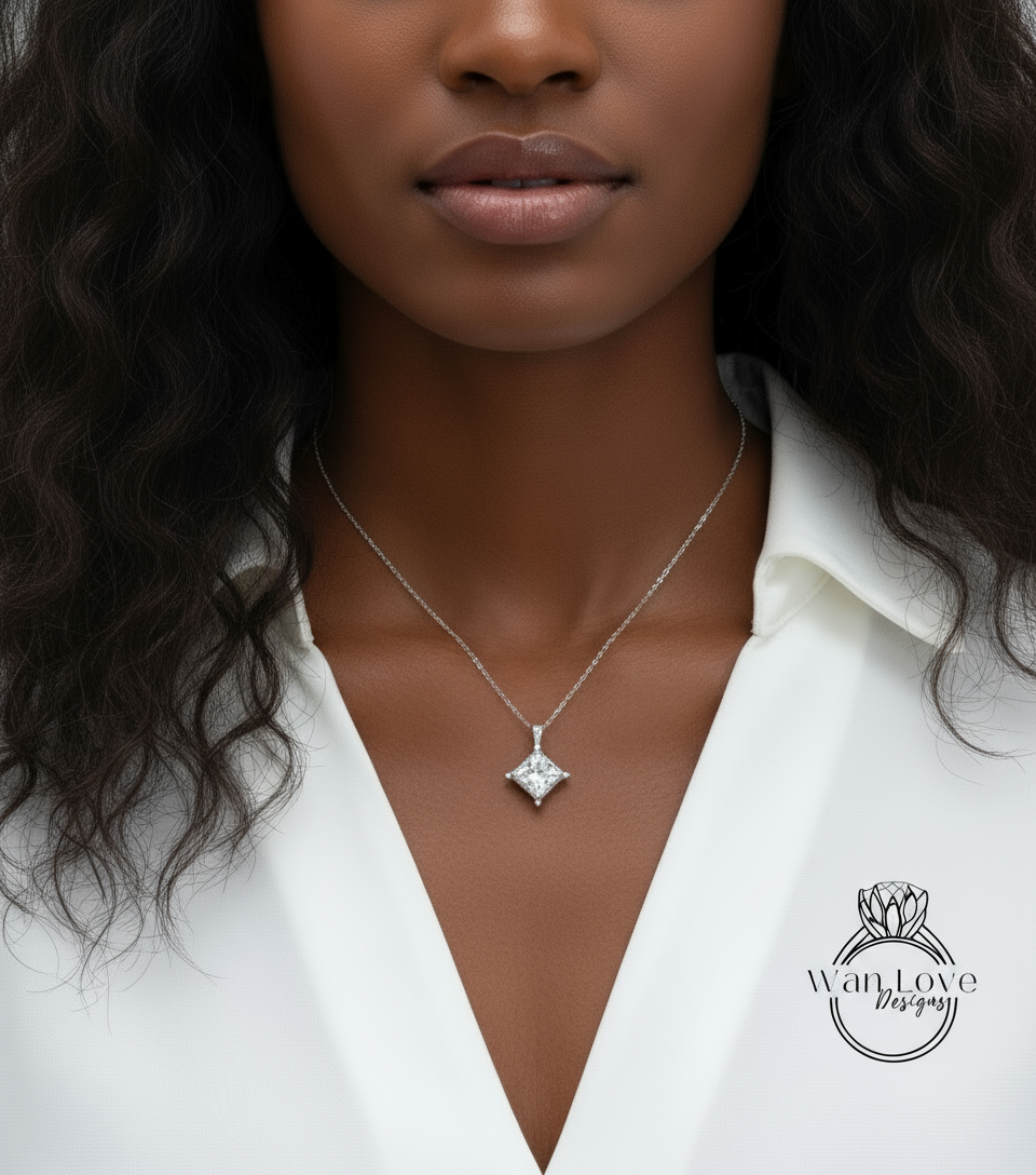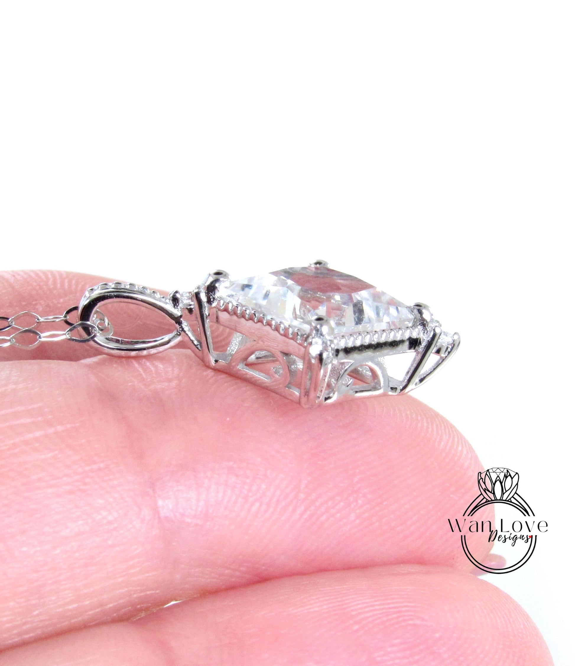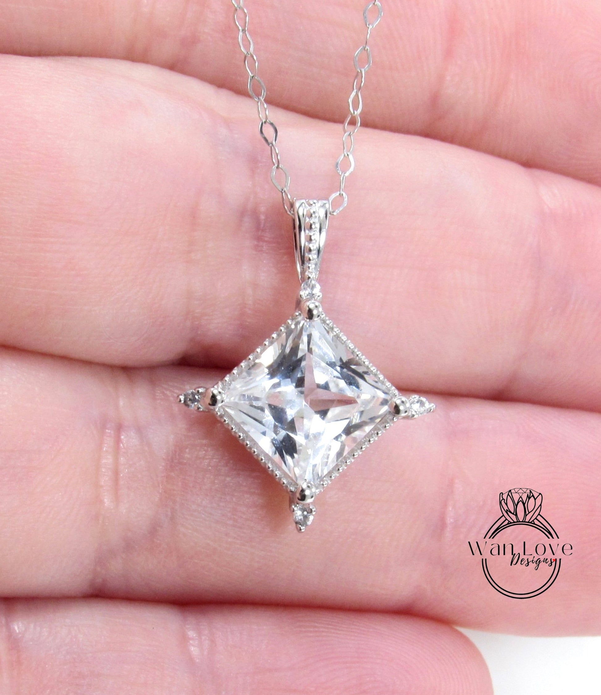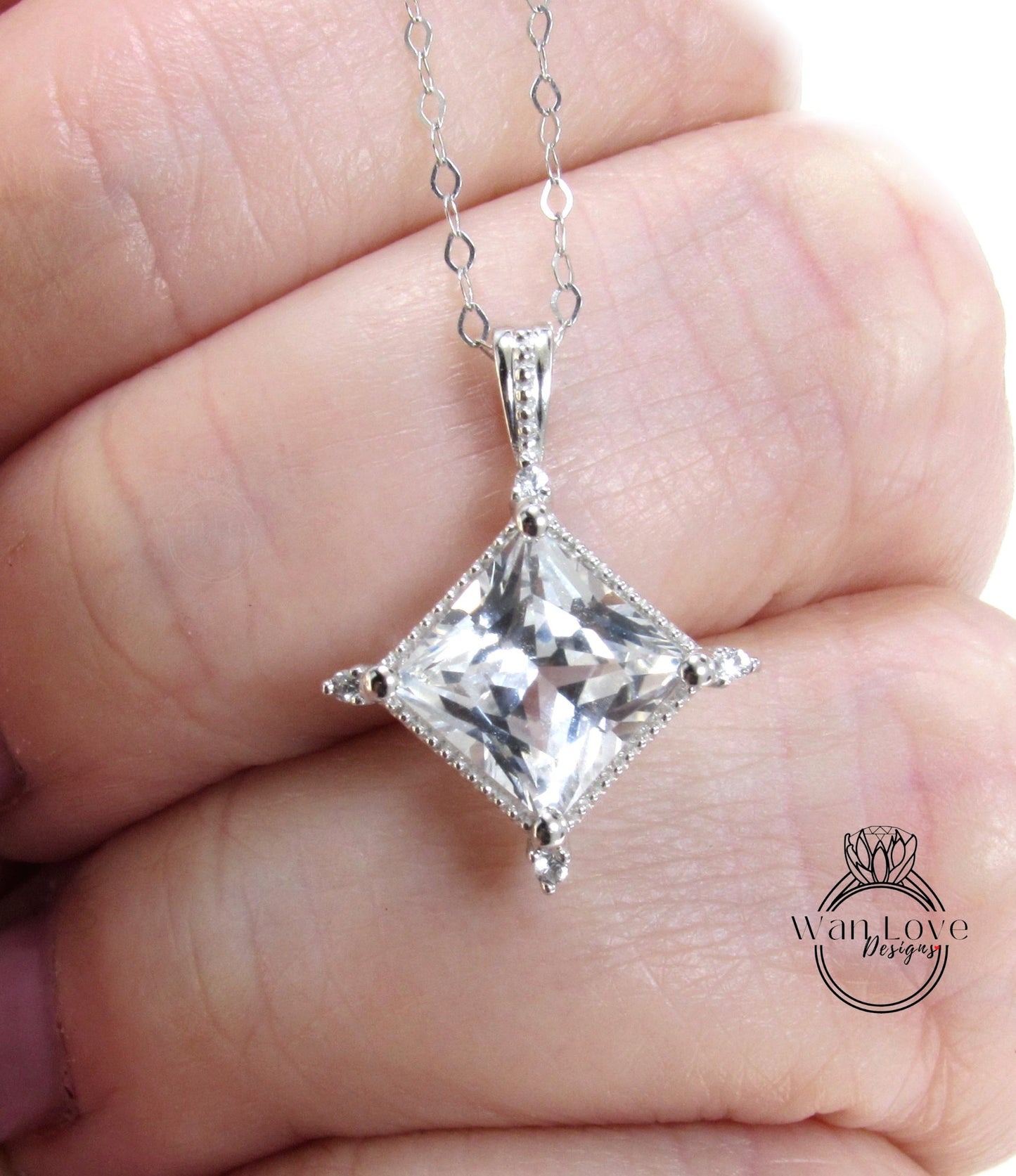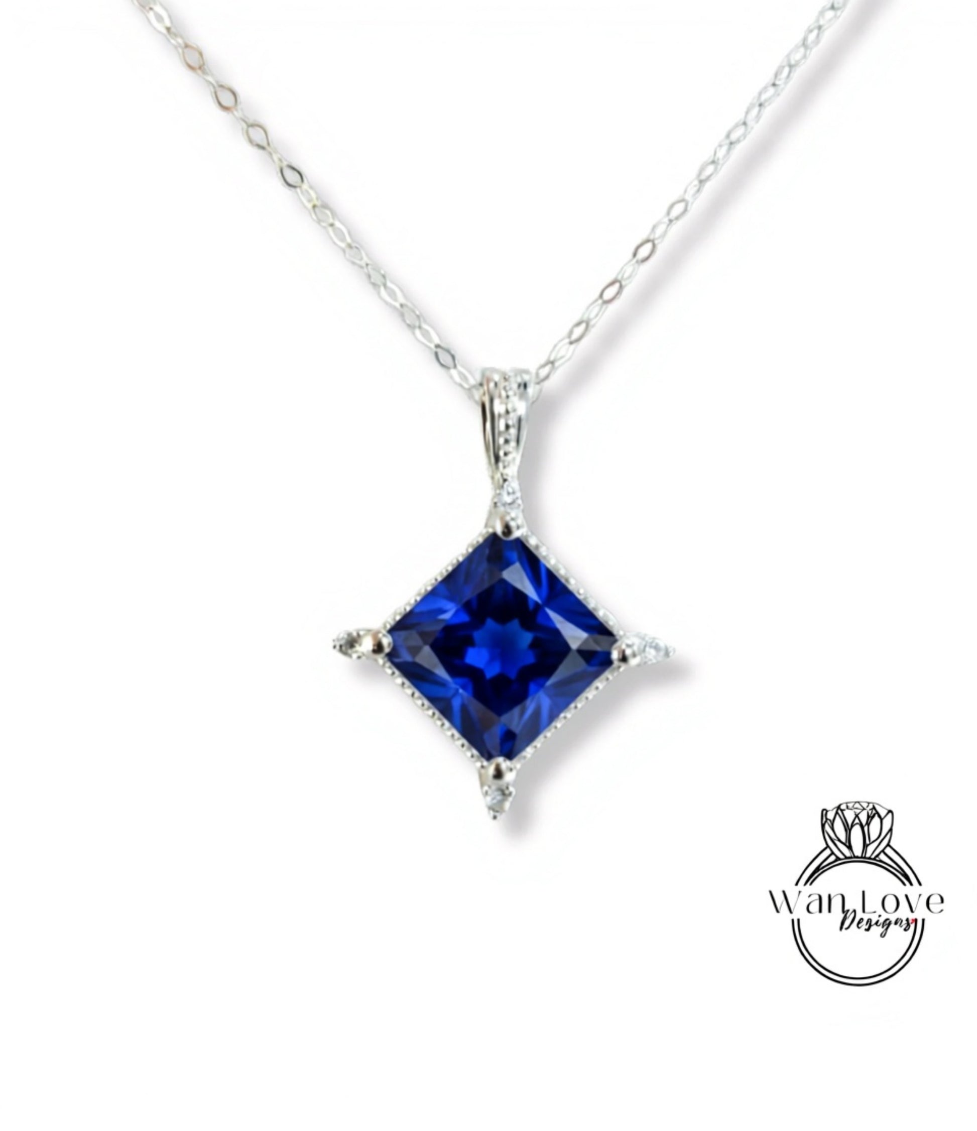 White Blue Pink Sapphire Moissanite Emerald Diamonds Princess North Star Milgrain Pendant Necklace Custom Wedding Anniversary Gift