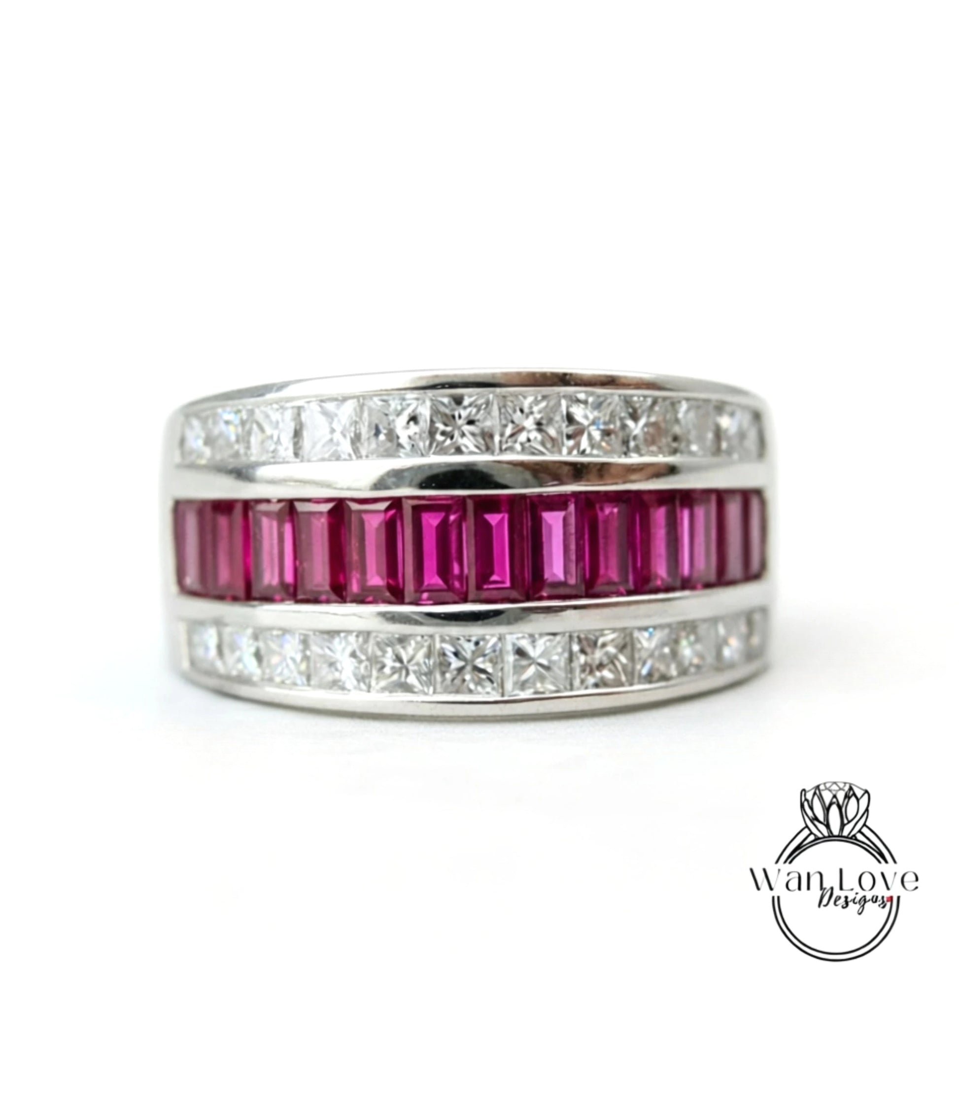 White gold Diamond men's Band vintage three row baguette princess cut wedding ring unique Birthstone ring anniversary ring solid gold band