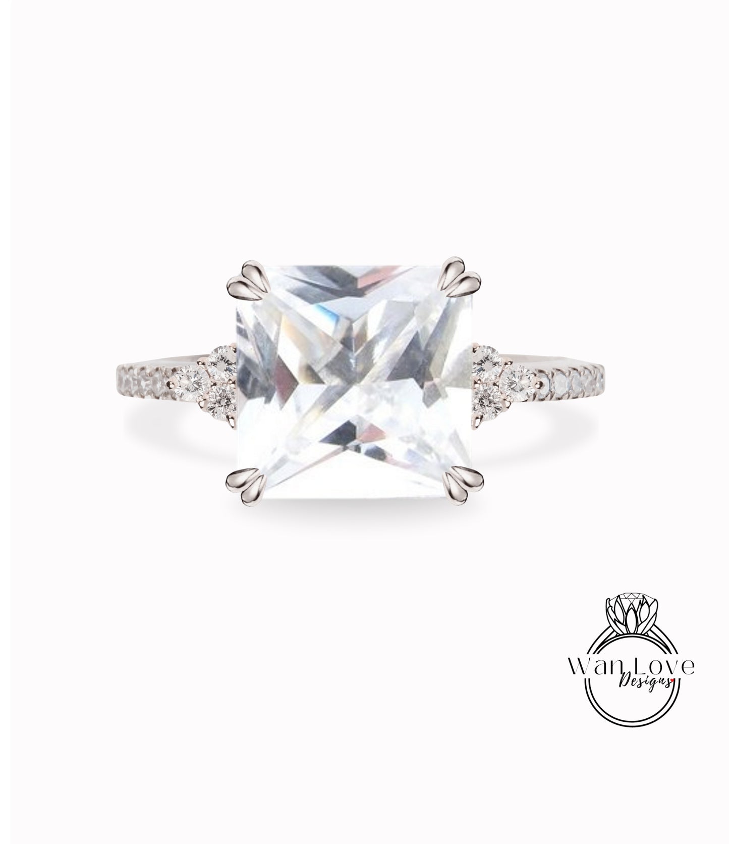 White Sapphire & Diamond Asscher Engagement Ring, Trio Gem, Custom, 14kt 18kt Gold, Platinum, Wedding, Anniversary, WanLoveDesigns