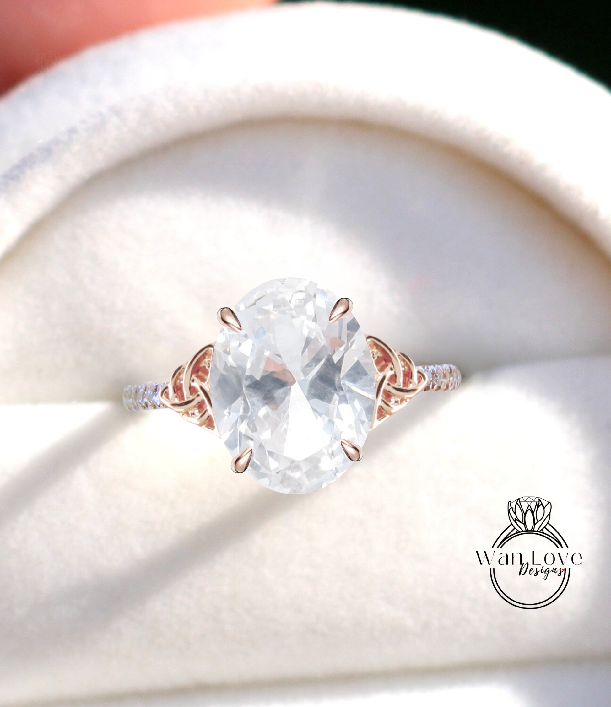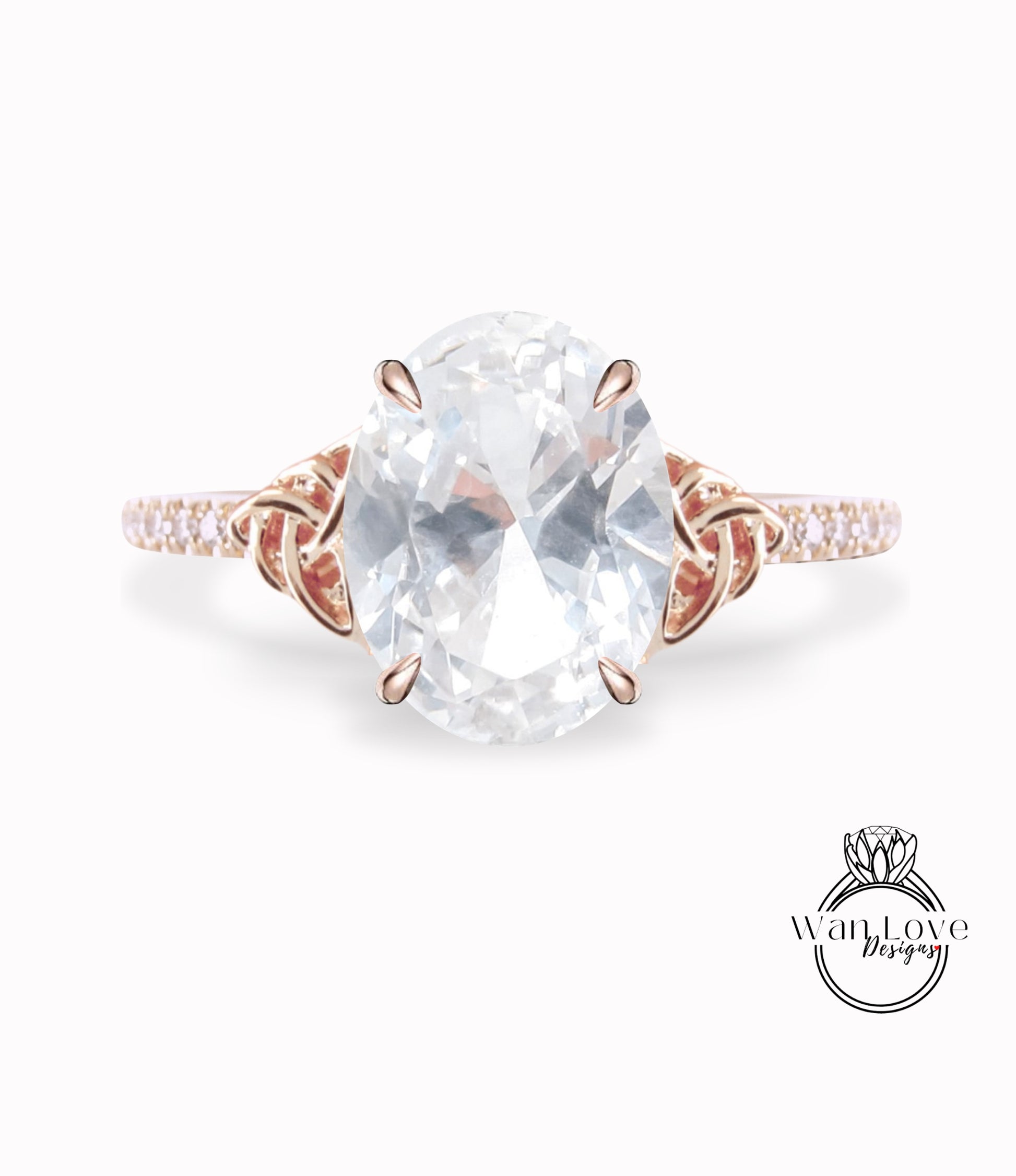 White Sapphire & Diamond Celtic Knot Oval Engagement Ring, Custom, Wedding, Double,14k 18k White Yellow Rose Gold,Platinum, Anniversary Gift
