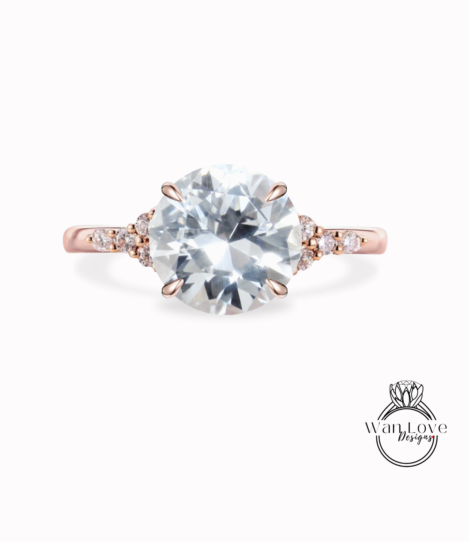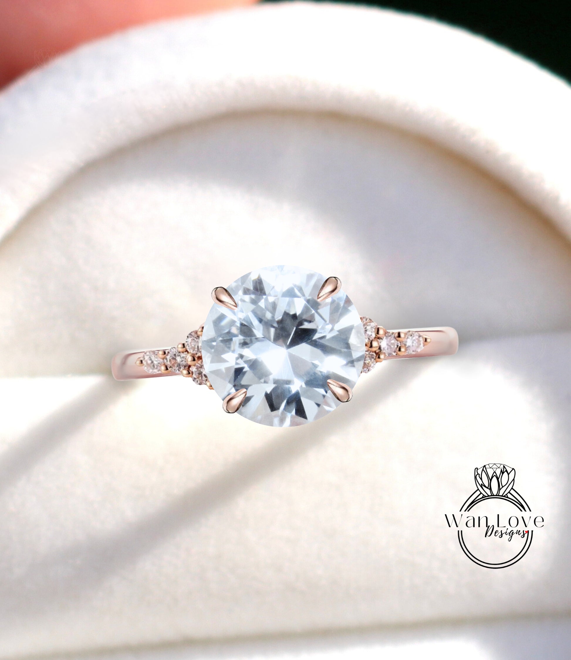 White Sapphire & Diamond Cluster thin dainty 3 gem stone Round Engagement Ring, Custom, 14kt 18kt Gold,Platinum, Bridal Wedding ring, Anniversary Gift