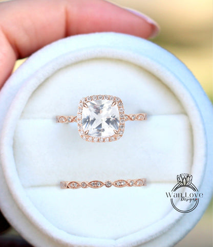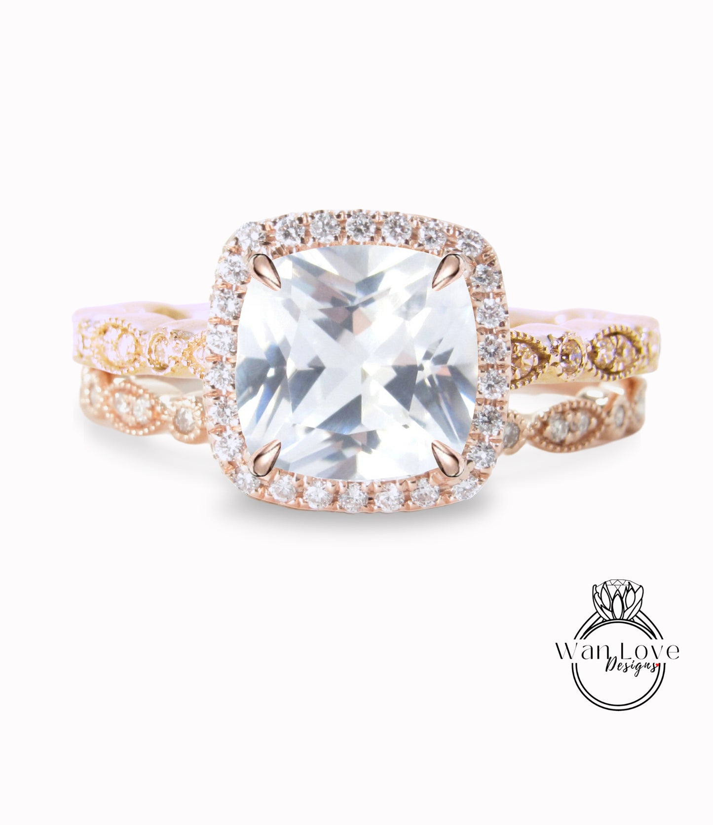 White Sapphire Diamond Cushion Halo Engagement Ring Milgrain Round Leaf Wedding Band Set, Custom-14k White-Yellow-Rose Gold-Platinum