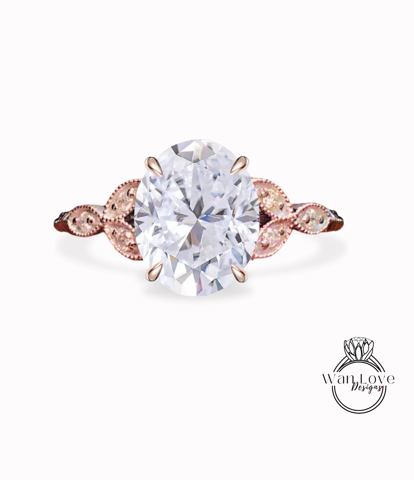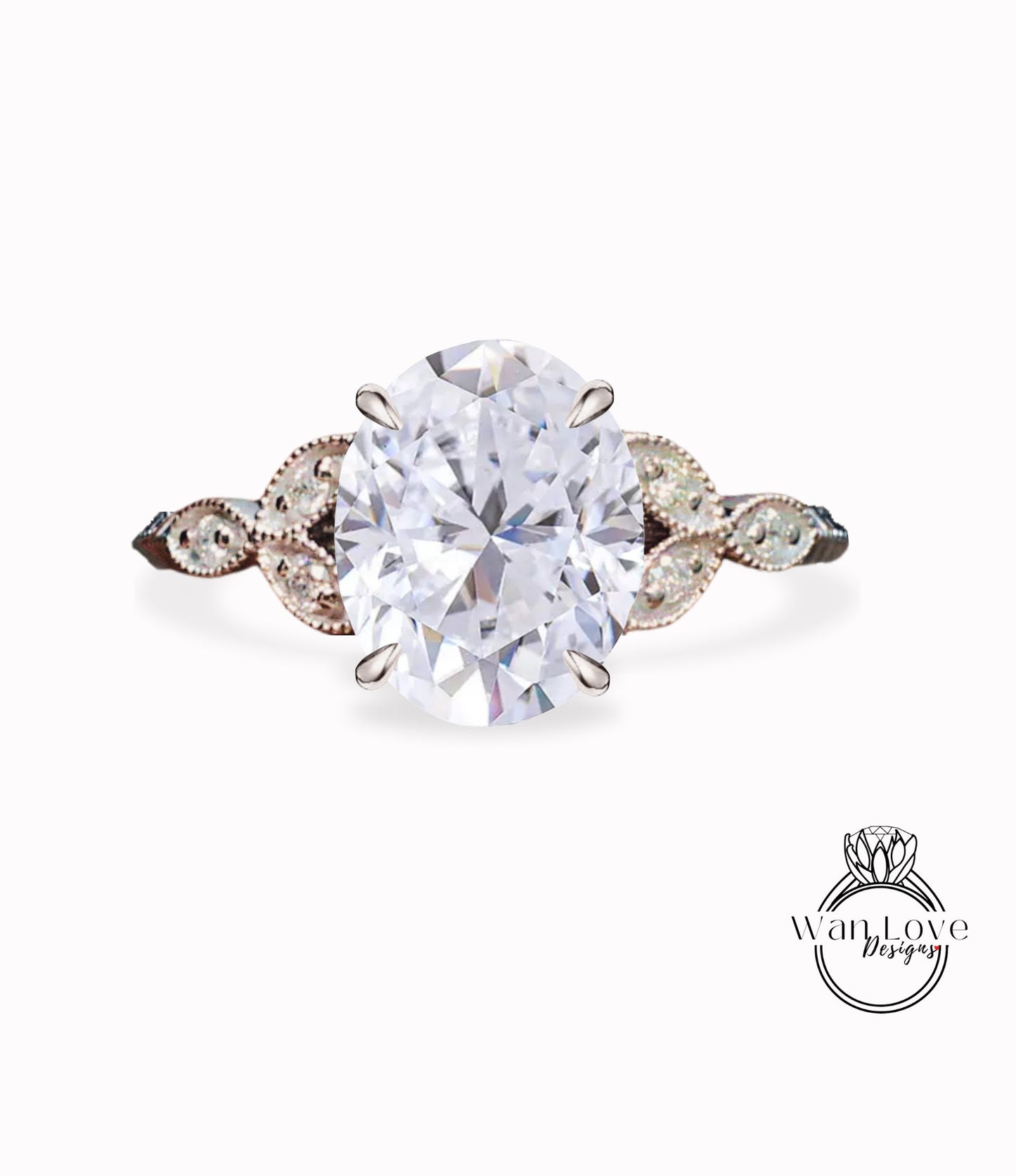 White Sapphire & Diamond Oval Leaf Antique Cluster Engagement Ring Engraved Milgrain or Smooth 14kt 18kt Gold Platinum Custom Wedding