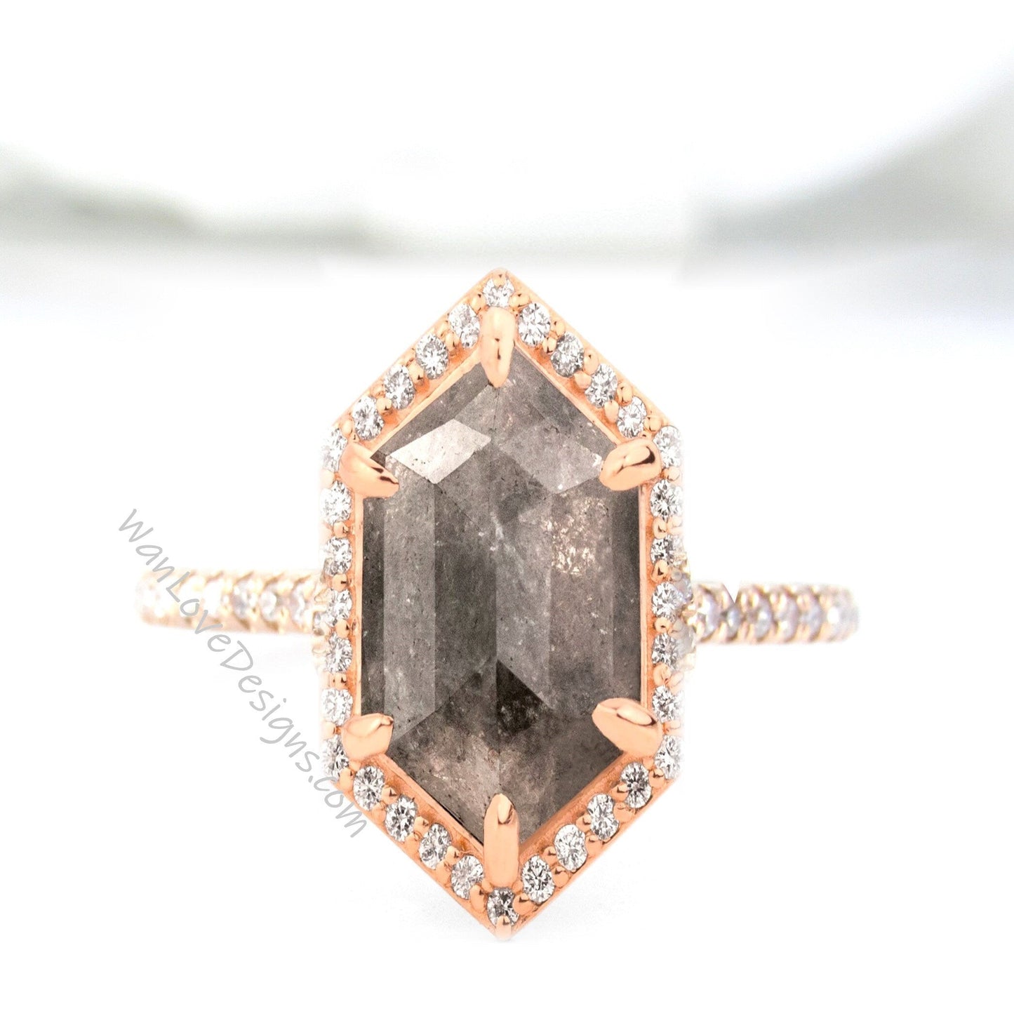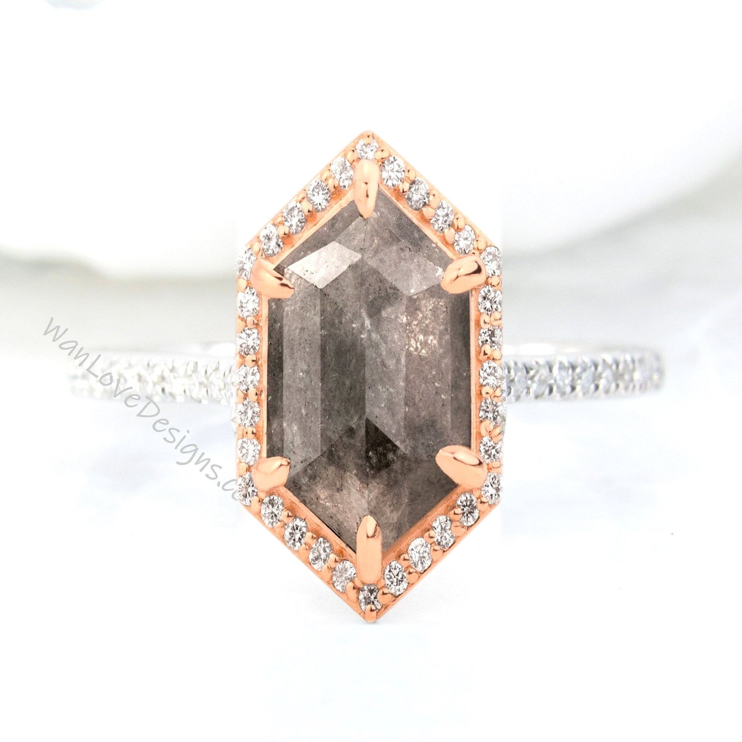 Elongated Hexagon Salt & Pepper Diamond Halo Engagement Ring Custom Wedding Anniversary Gift 14kt 18kt Gold, Platinum, WanLoveDesigns.