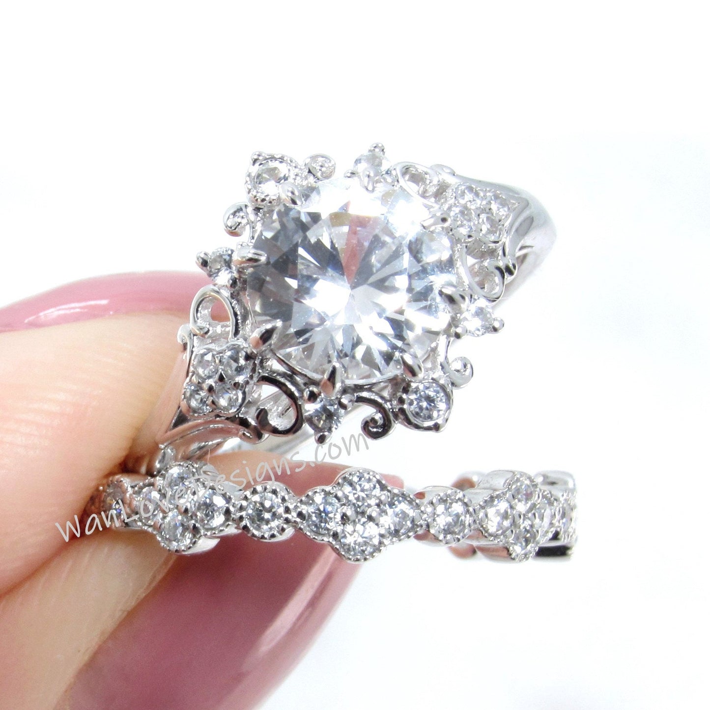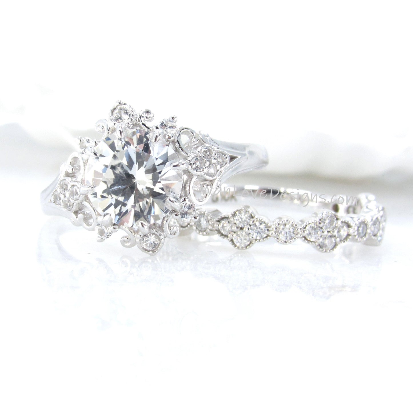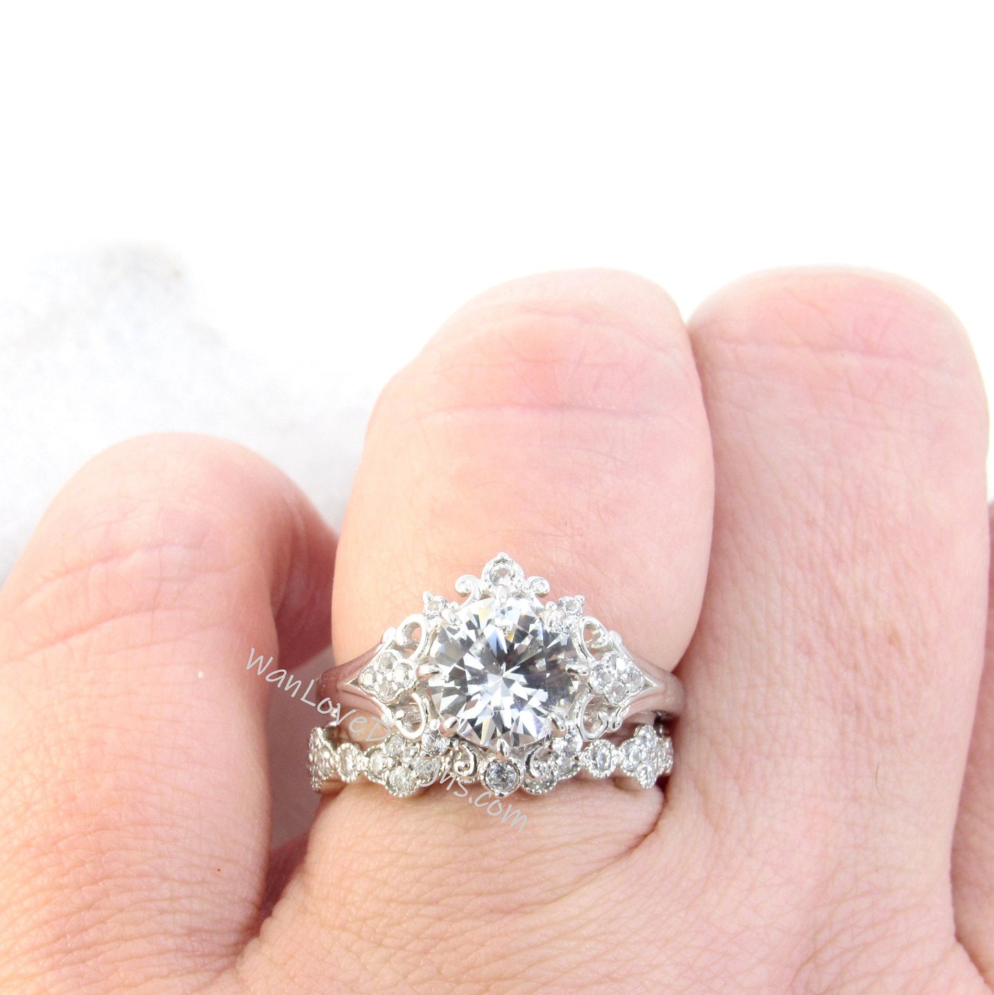White Sapphire Ornate Halo Engagement Ring Set, Floral Quatrefoil Wedding Band, Vintage Round Halo, 2ct-8mm-Custom-Wedding-Anniversary Gift