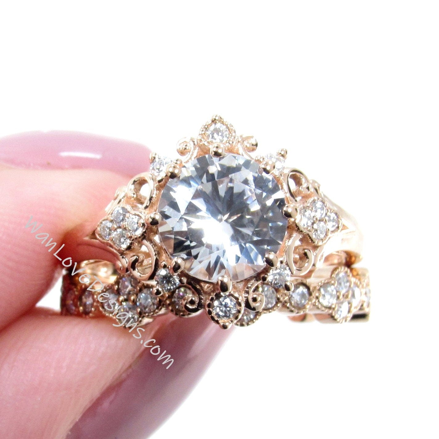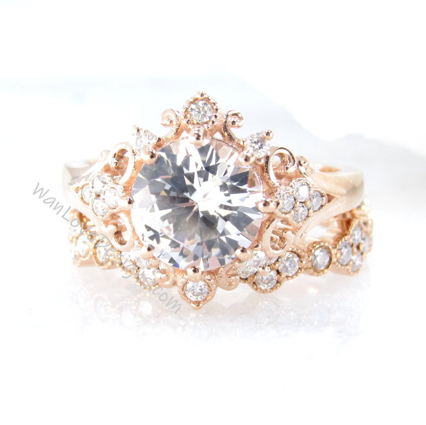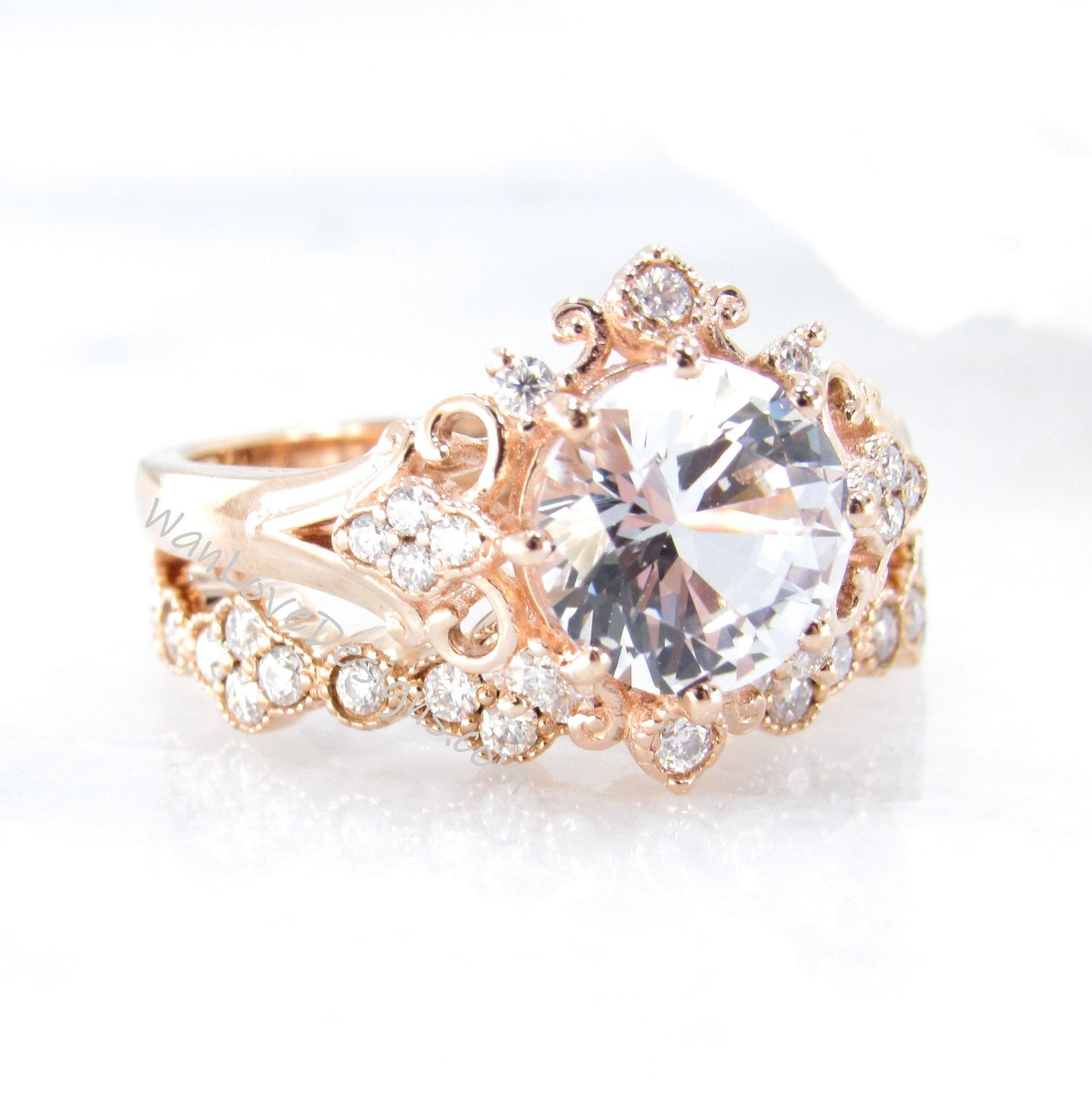 White Sapphire Ornate Halo Engagement Ring Set, Floral Quatrefoil Wedding Band, Vintage Round Halo, 2ct-8mm-Custom-Wedding-Anniversary Gift