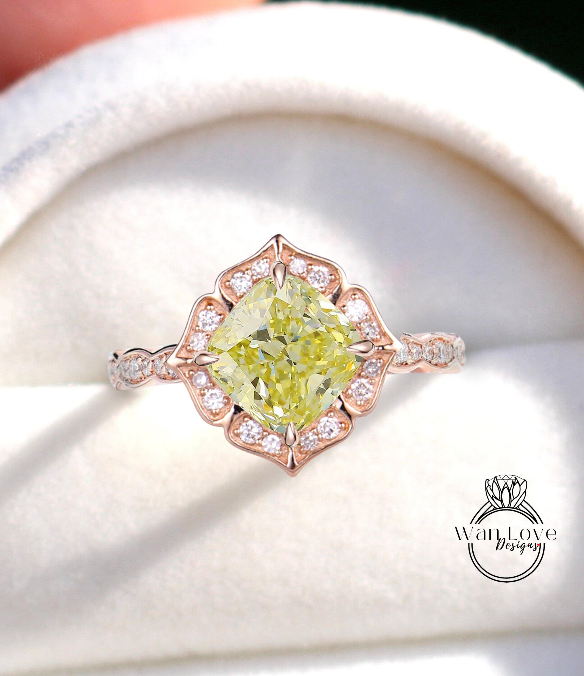Yellow Diamond Scalloped Floral Cushion Halo Leaf Antique Engagement Ring, WITH or WITHOUT Milgrain, 14k 18k Gold, Platinum Anniversary Gift