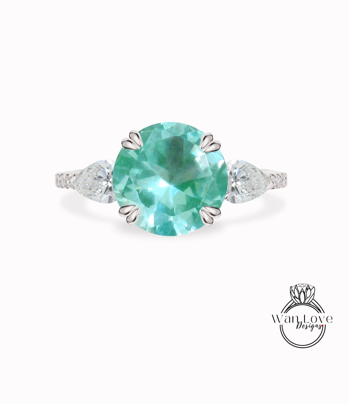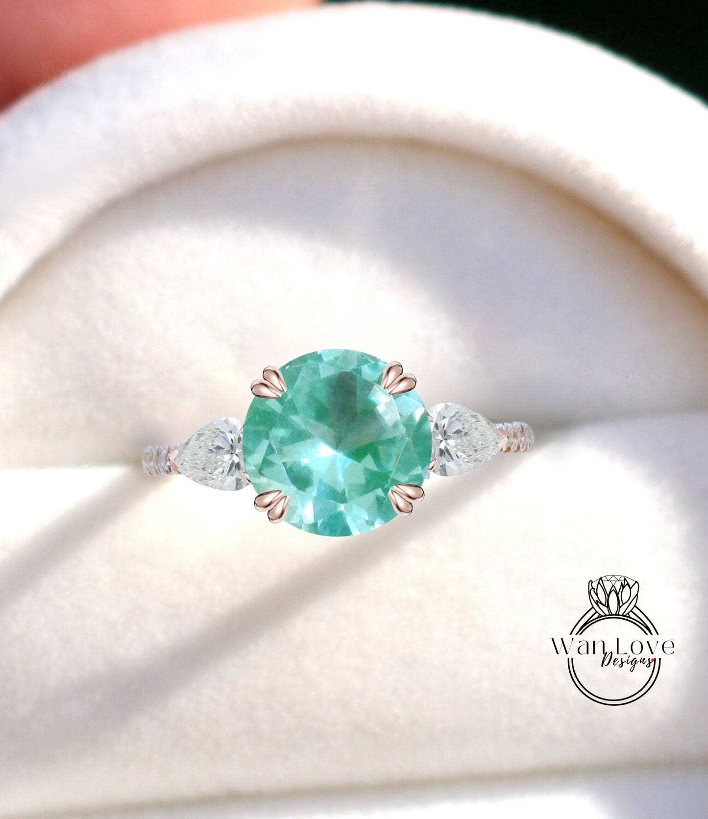 Teal Spinel Round Pear Diamond Ring, Three Stone Moissanite Ring, Round spinel engagement Ring, Diamond Band Ring