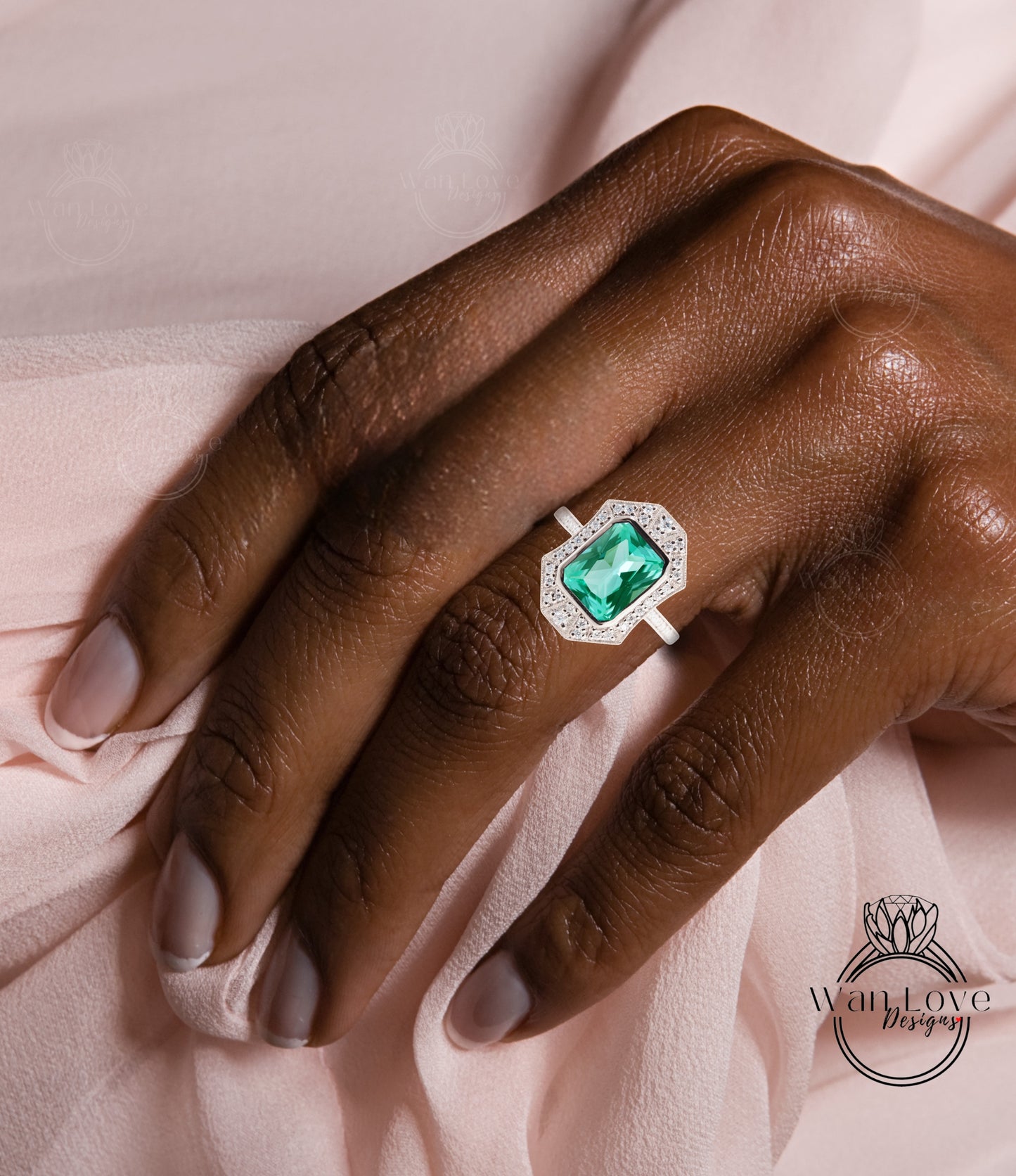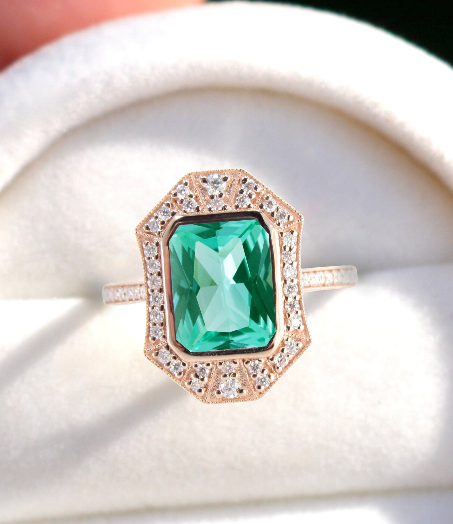 Art Deco Halo Teal Spinel & Diamond Ring, Milgrain Bezel Halo Ring, Spinel Moissanite Ring, Vintage Inspired Ring
