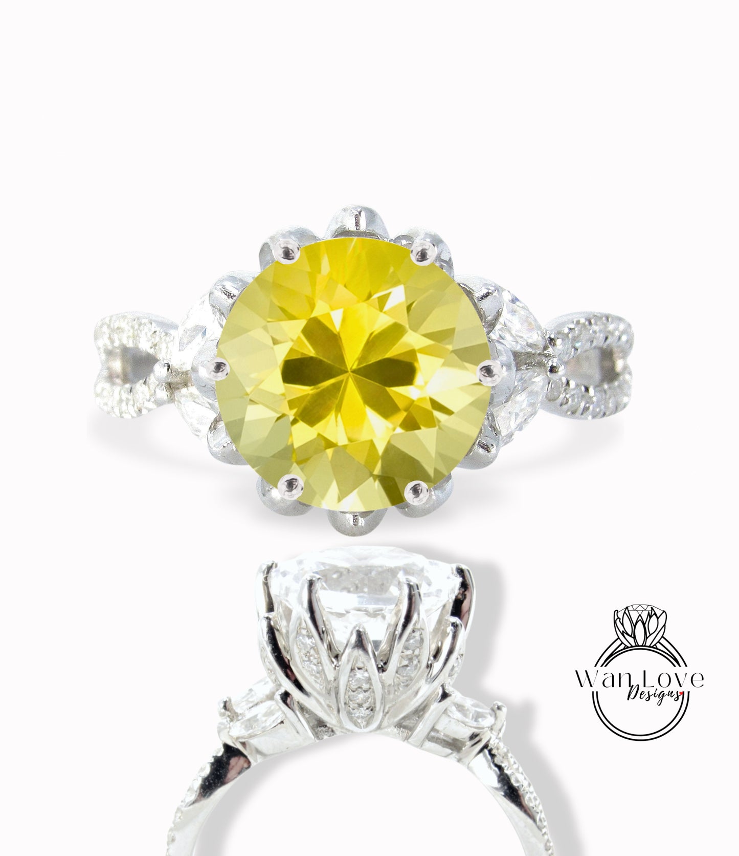 Yellow Sapphire & Diamond Lotus Flower Engagement Ring Marquise Split Shank Leaf 14k 18k White Yellow Rose Gold-Platinum-Custom-Wedding
