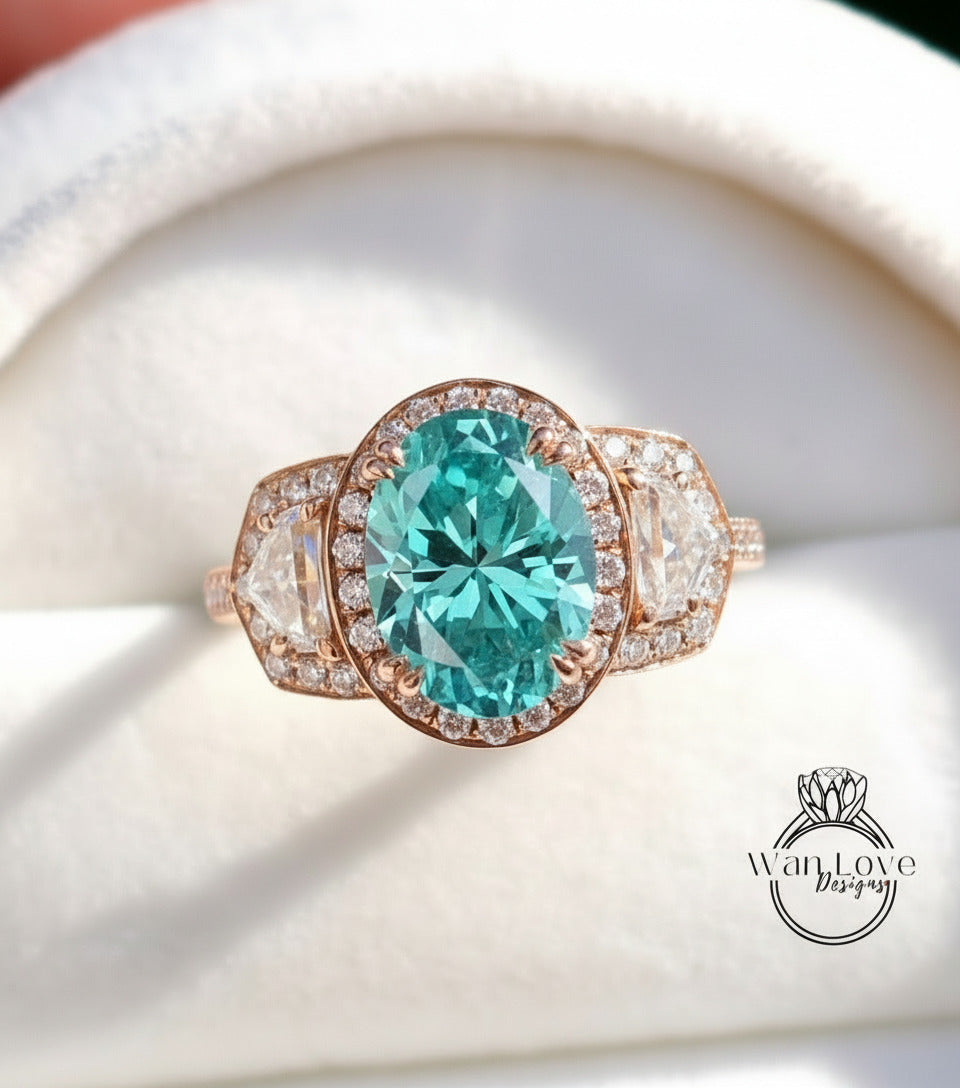 Teal Blue Green Moissanite & Diamond Oval Engagement Ring half moon trapezoid, 3ct, 9x7mm, Custom, 14k 18k White Yellow Rose Gold, Platinum